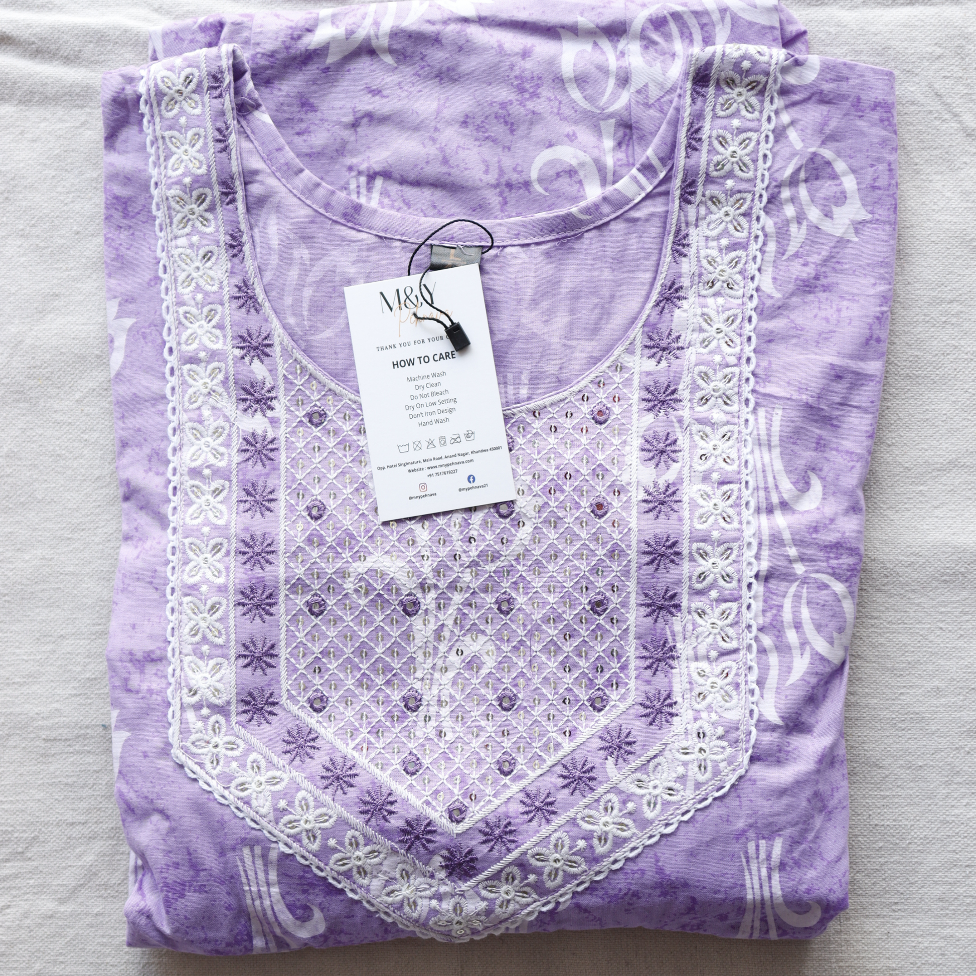 Crafted from premium cotton, the Lavender Cotton Frock Style Suit Set offers a perfect blend of comfort and sophistication. Its breathable fabric ensures all-day freshness, while the frock silhouette adds a timeless charm. Ideal for both casual and festive occasions, this suit set provides a graceful fit that enhances your elegance effortlessly.