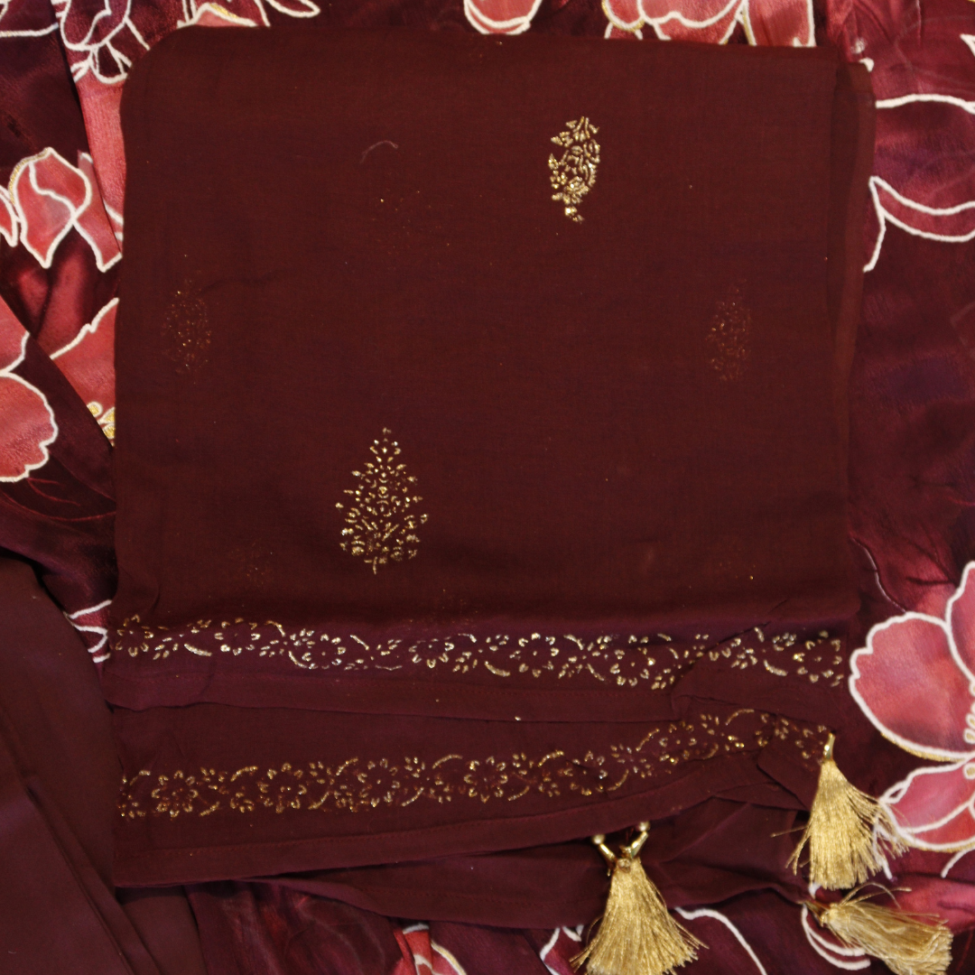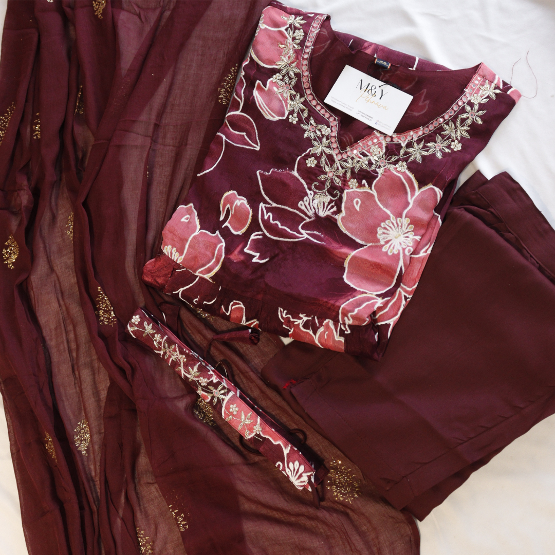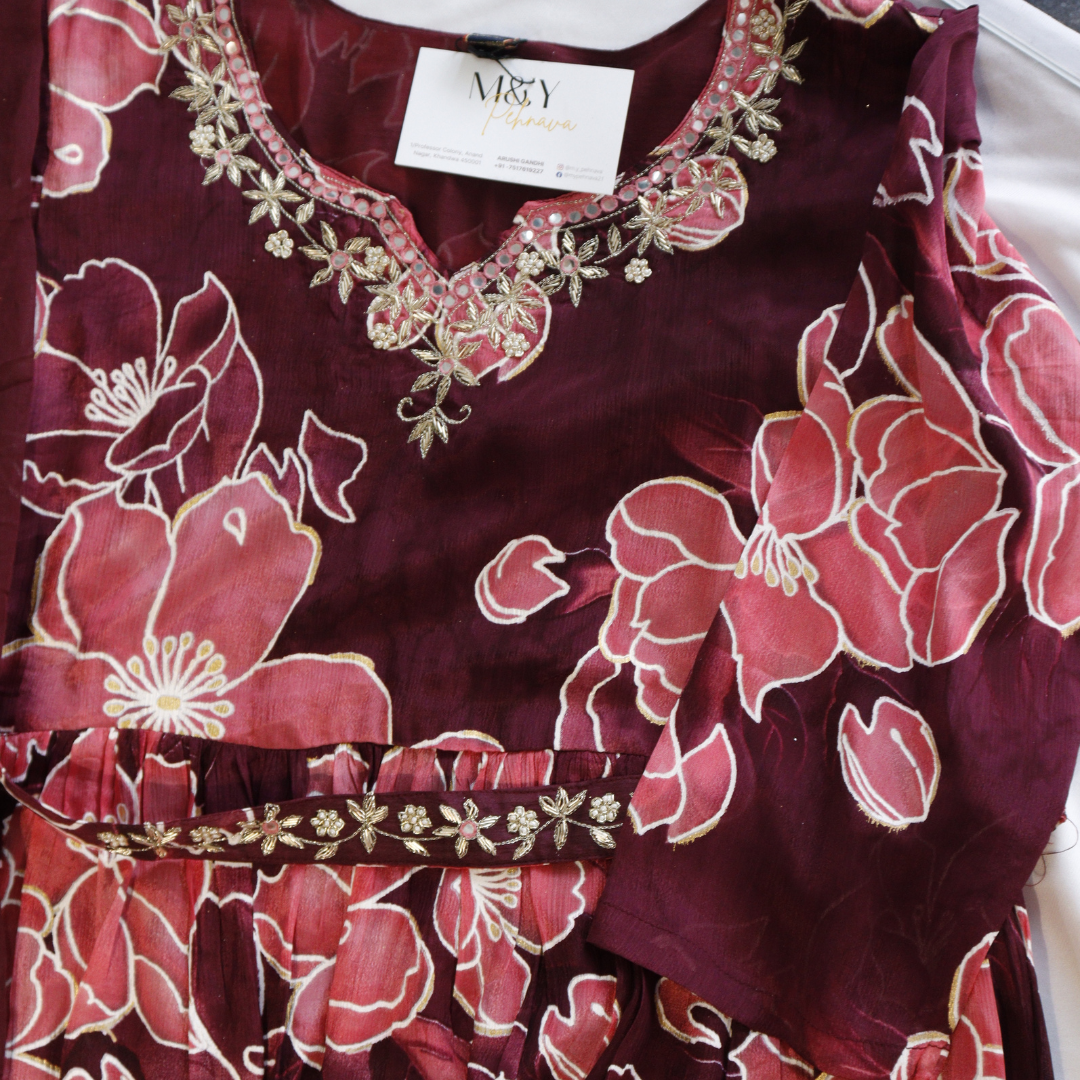 This Maroon Pure Chinon Suit Set with Belt is the perfect combination of comfort and style. The lightweight, breathable chiffon fabric will keep you cool and comfortable while the elegant maroon color will make you the envy of all. The set includes a matching belt for a finished look that will set you apart from the rest.