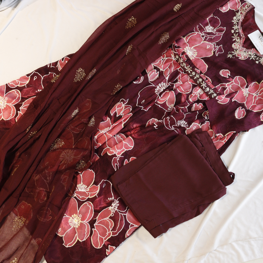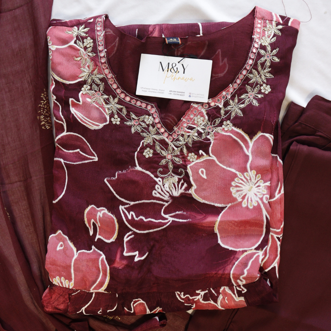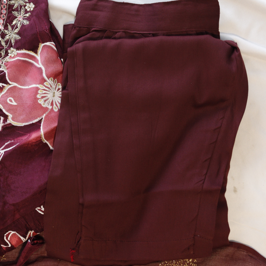 This Maroon Pure Chinon Suit Set with Belt is the perfect combination of comfort and style. The lightweight, breathable chiffon fabric will keep you cool and comfortable while the elegant maroon color will make you the envy of all. The set includes a matching belt for a finished look that will set you apart from the rest.