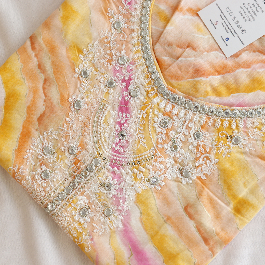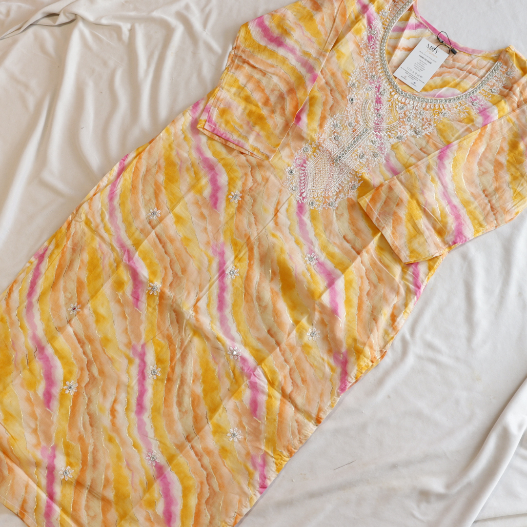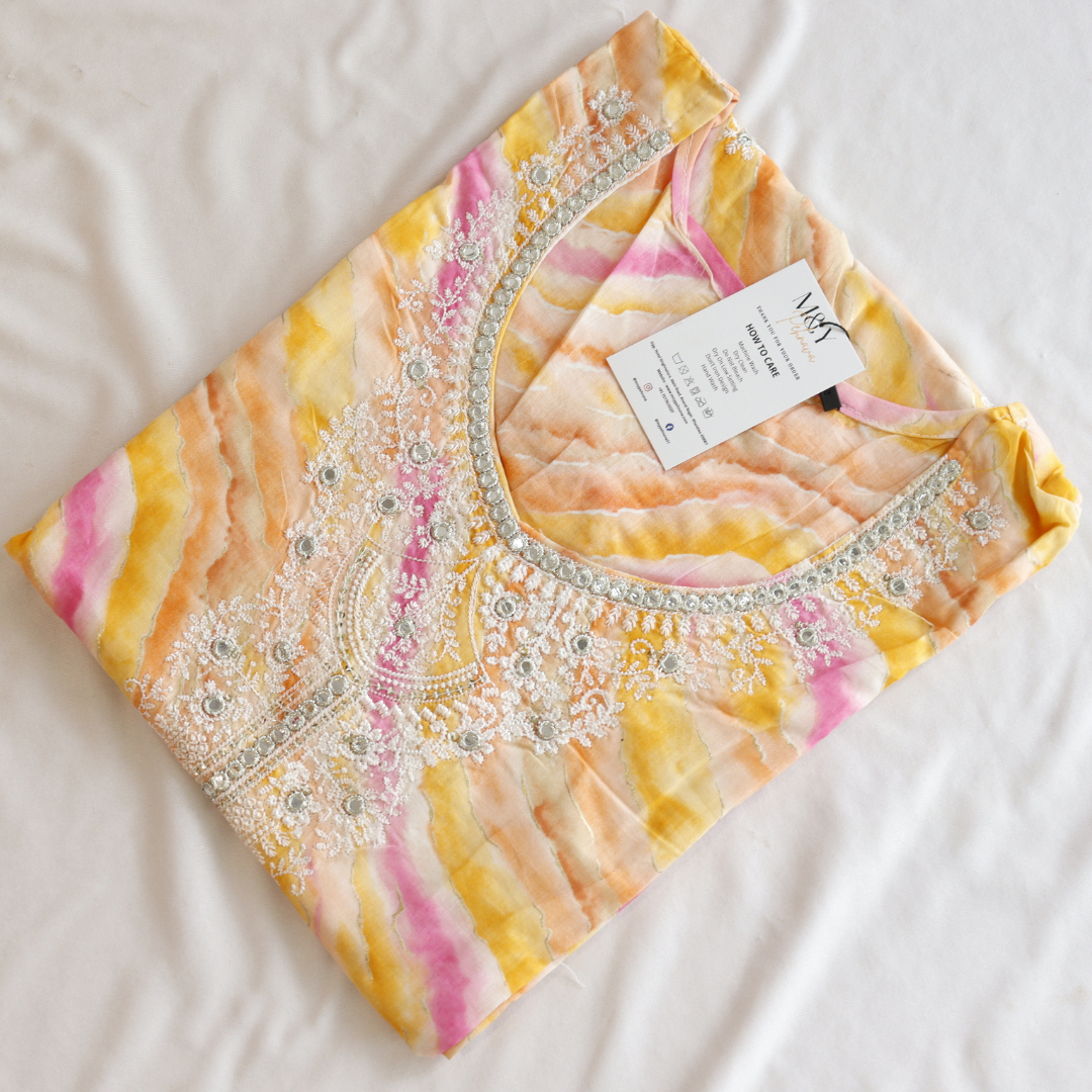 This Orange Leheriya Cotton Kurti combines traditional Indian design with comfortable cotton material. Its vibrant orange color and intricate leheriya pattern make it a unique and stylish addition to any wardrobe. Made with high-quality cotton, it offers breathability and easy maintenance for everyday wear.