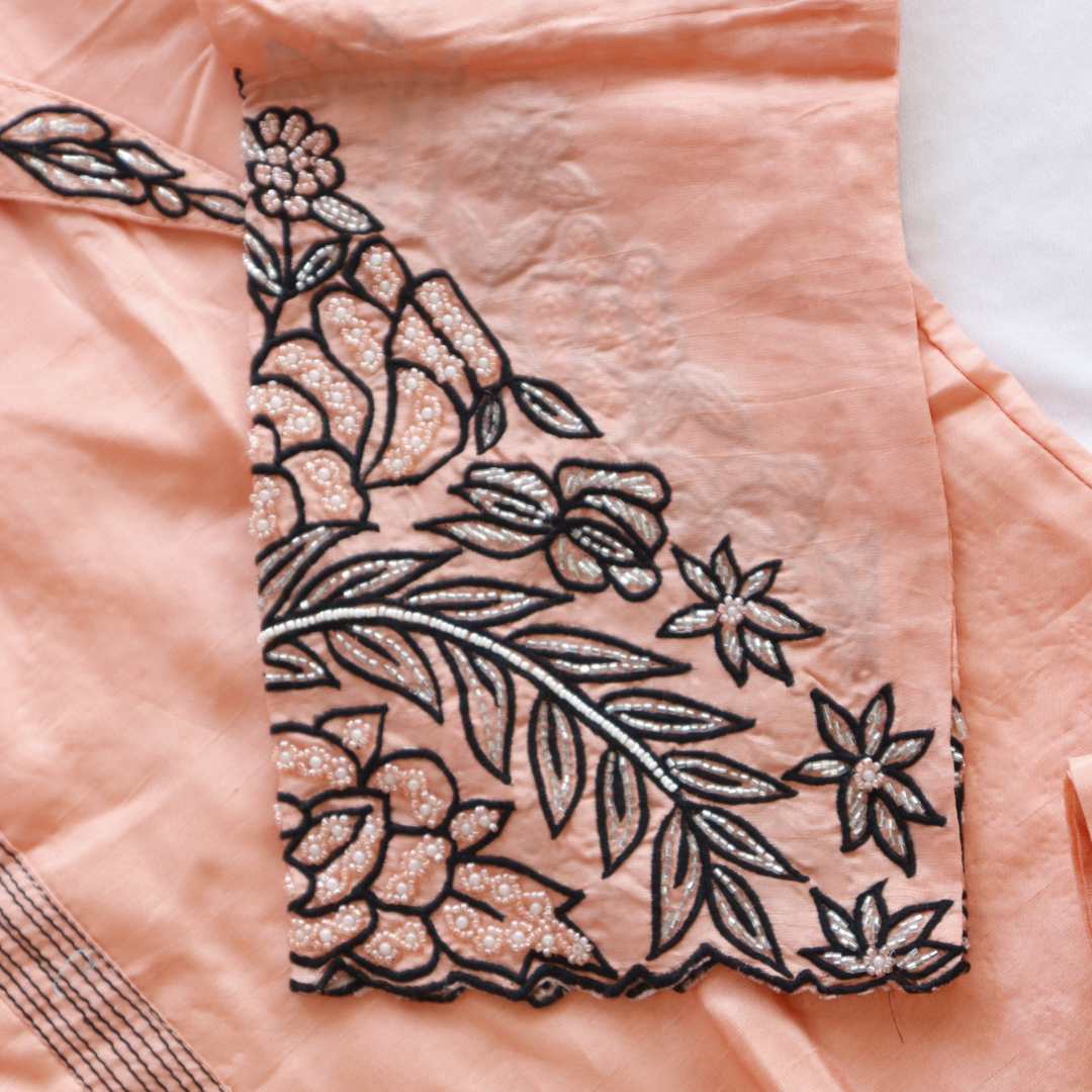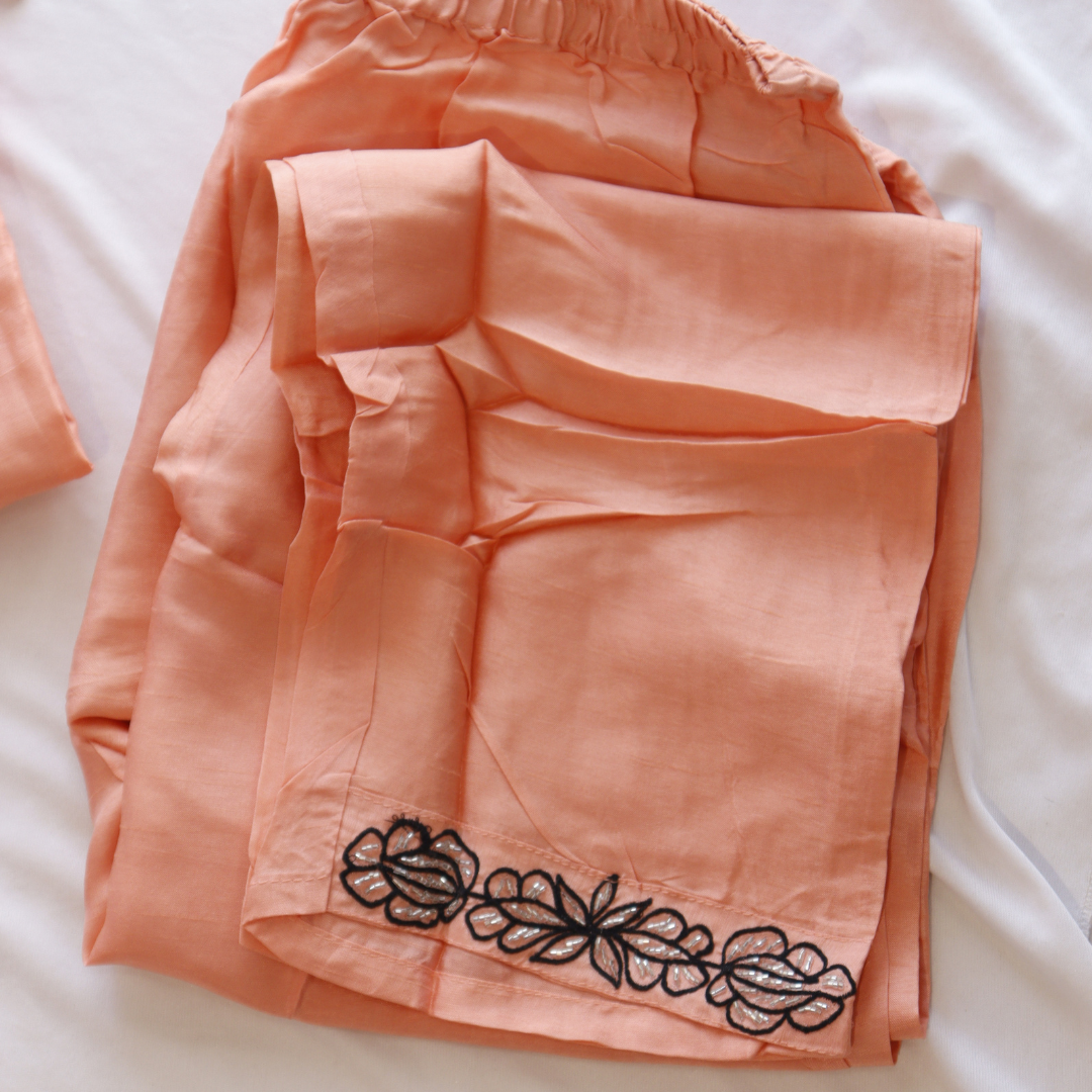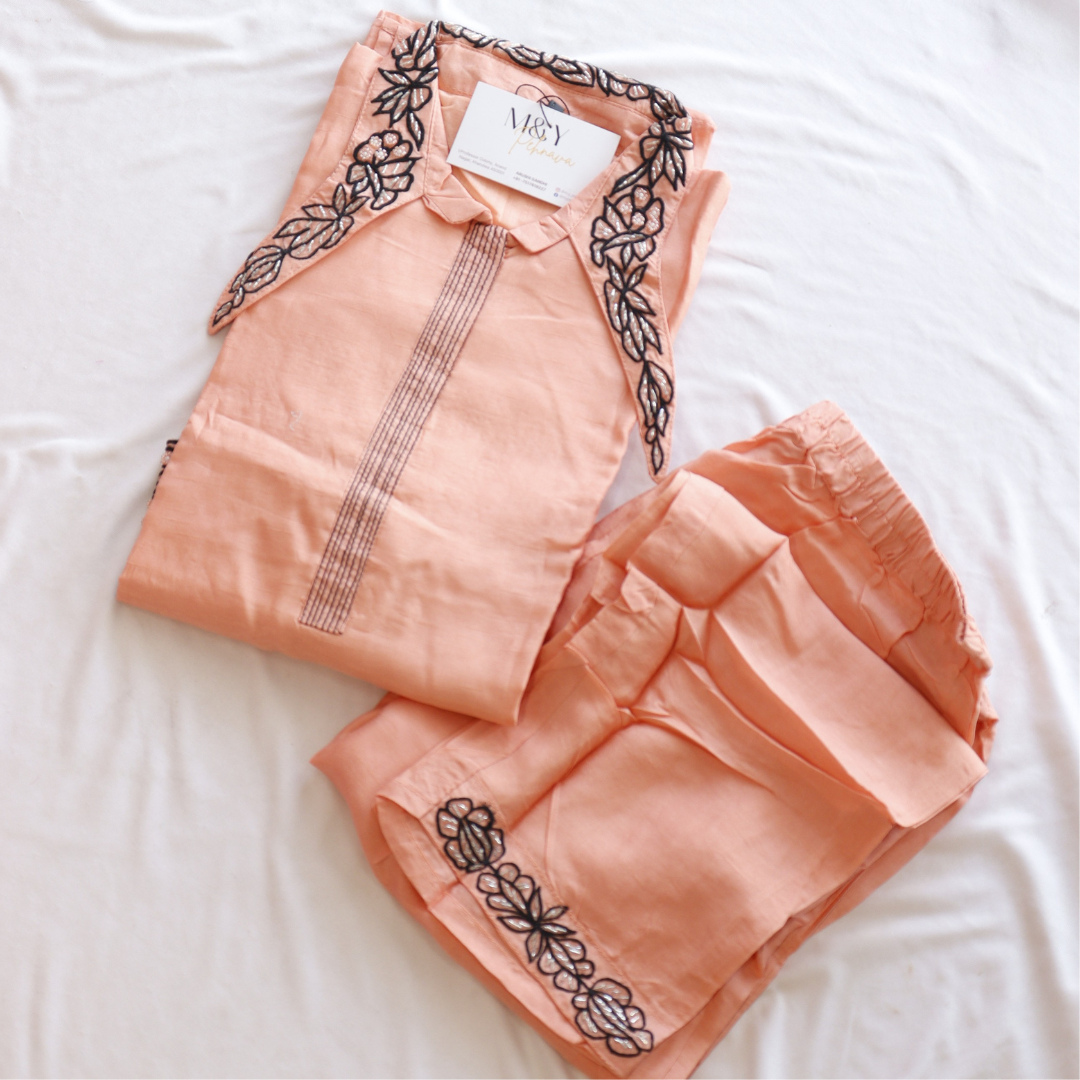 This Peach Beads Work Co-Ord Set is made from high-quality beads and features expert craftsmanship. Its comfortable fit and stylish design will make you stand out in any occasion. Enjoy the elegance and charm of this gorgeous set.