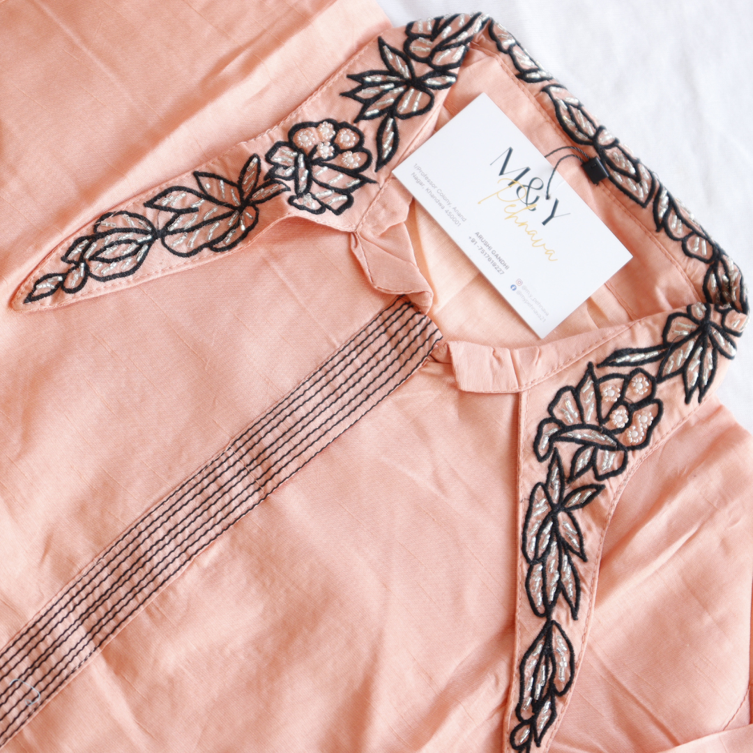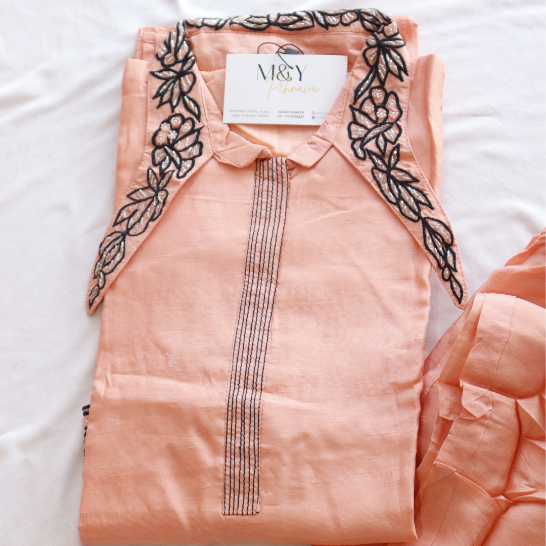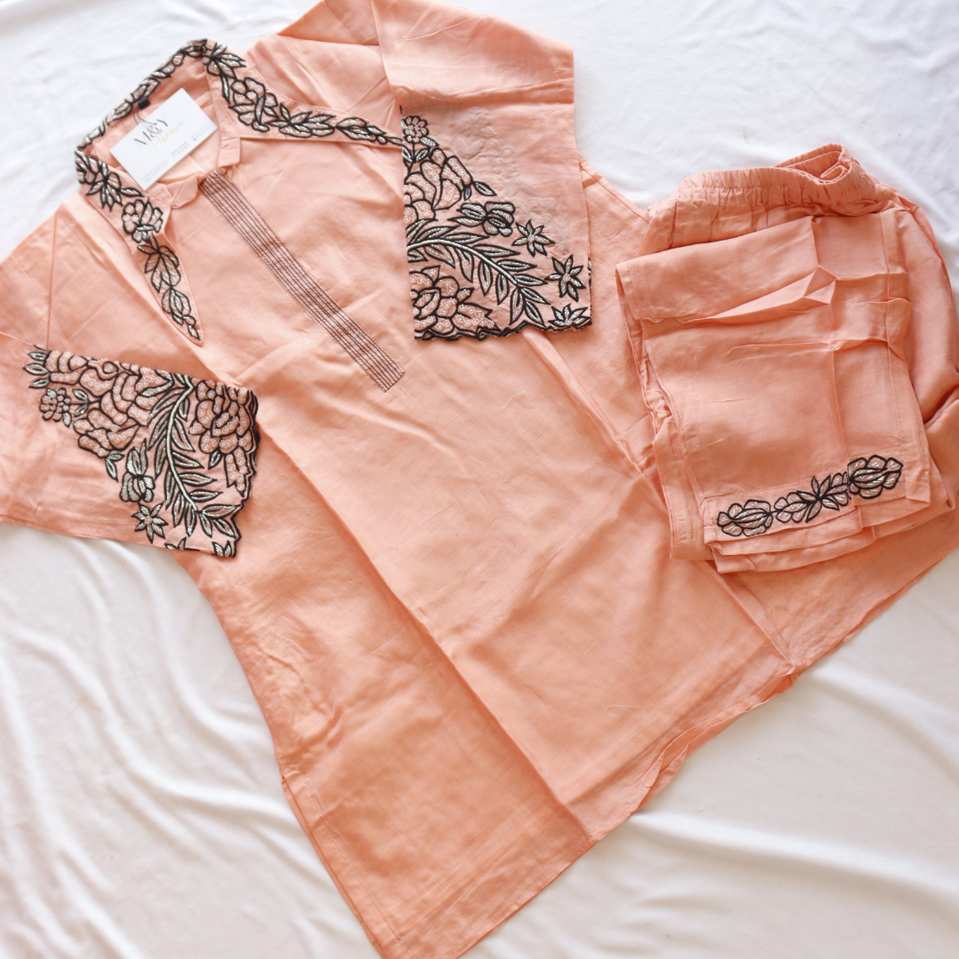 This Peach Beads Work Co-Ord Set is made from high-quality beads and features expert craftsmanship. Its comfortable fit and stylish design will make you stand out in any occasion. Enjoy the elegance and charm of this gorgeous set.