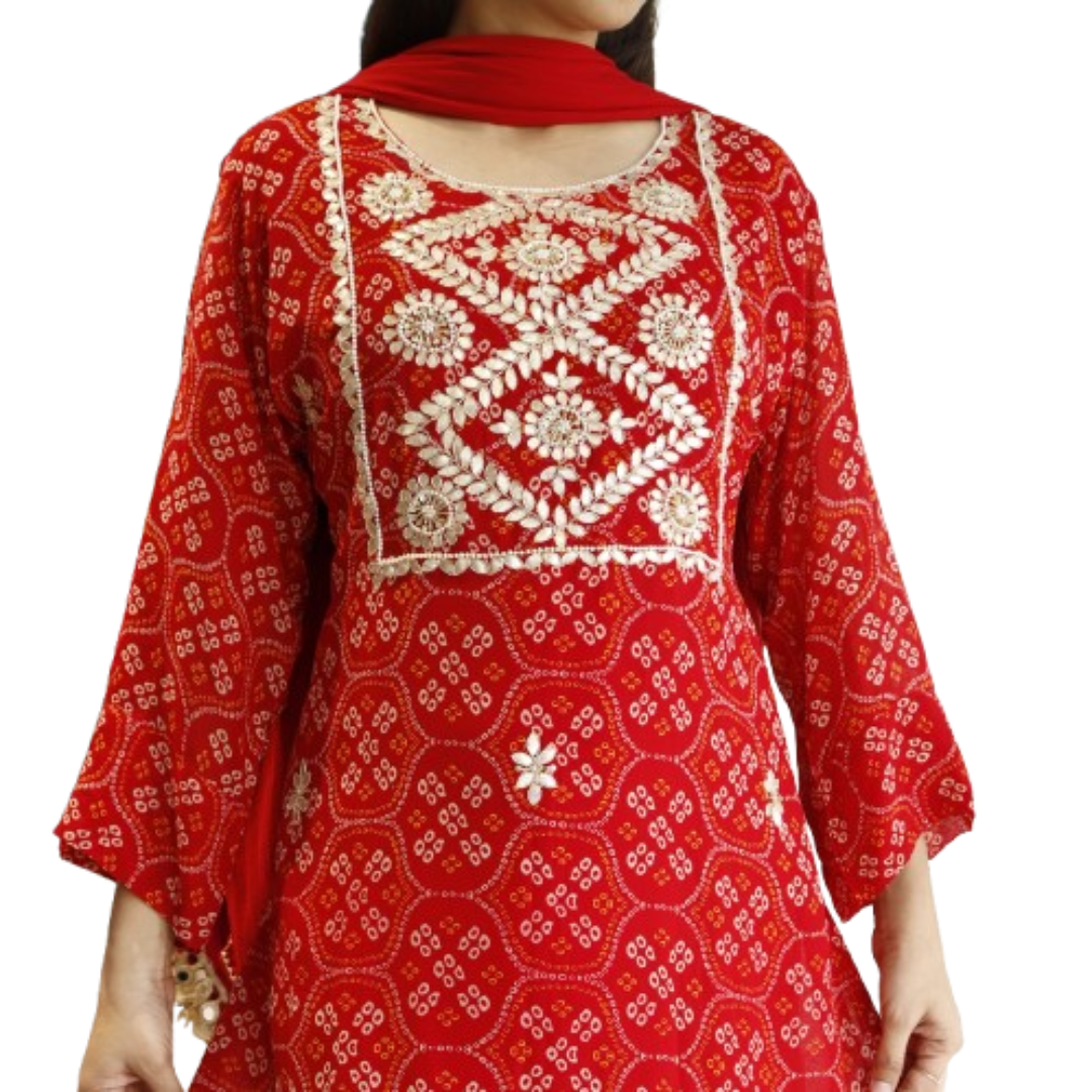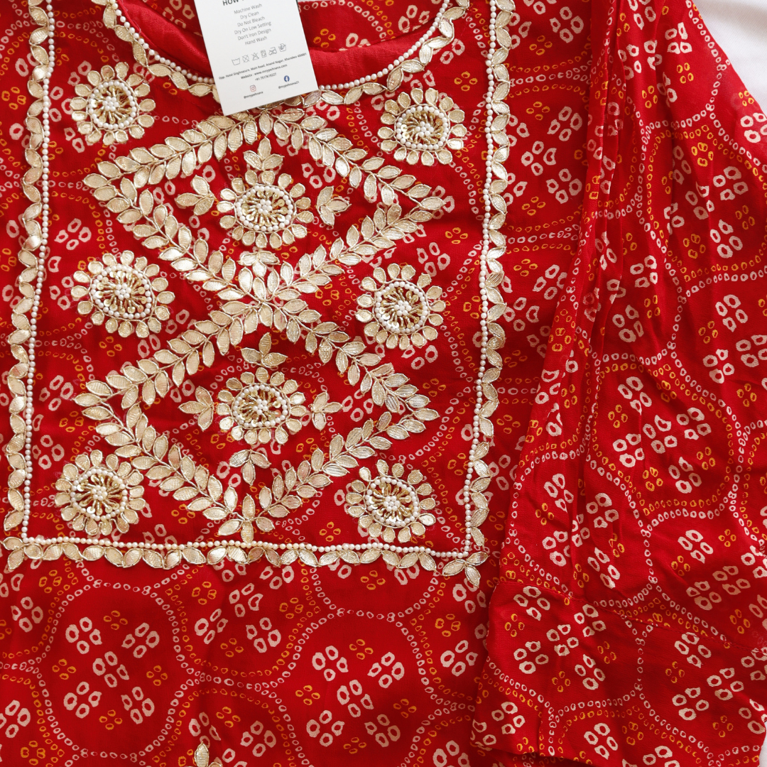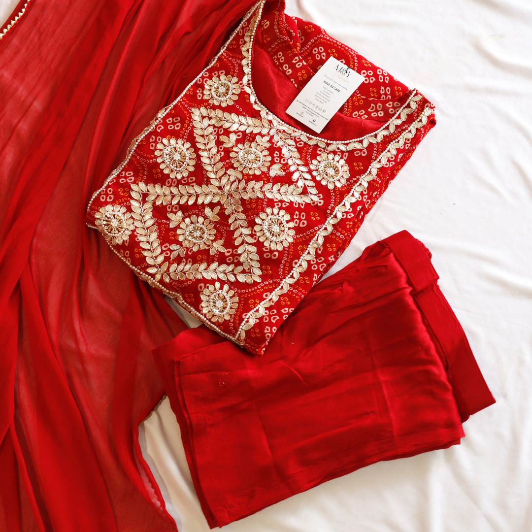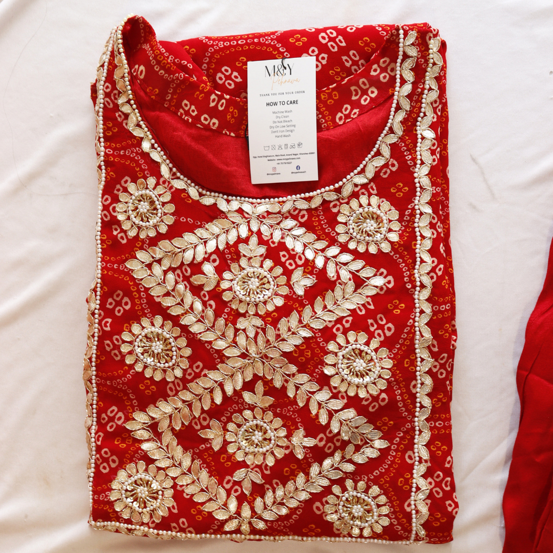 Elevate your ethnic wardrobe with our Red Bandhej Gota Patti Suit Set. Featuring a vibrant red bandhej design and intricate gota patti detailing, this set is perfect for weddings, festivals, and special occasions. Made with high-quality fabric, this set not only looks stunning but also feels comfortable and luxurious. Complete your look with this elegant and timeless piece.