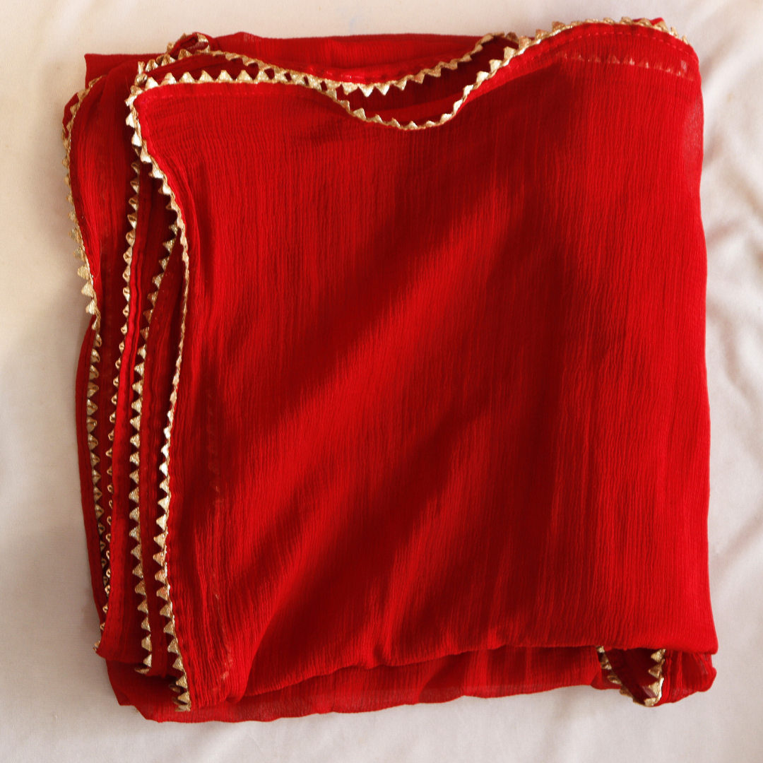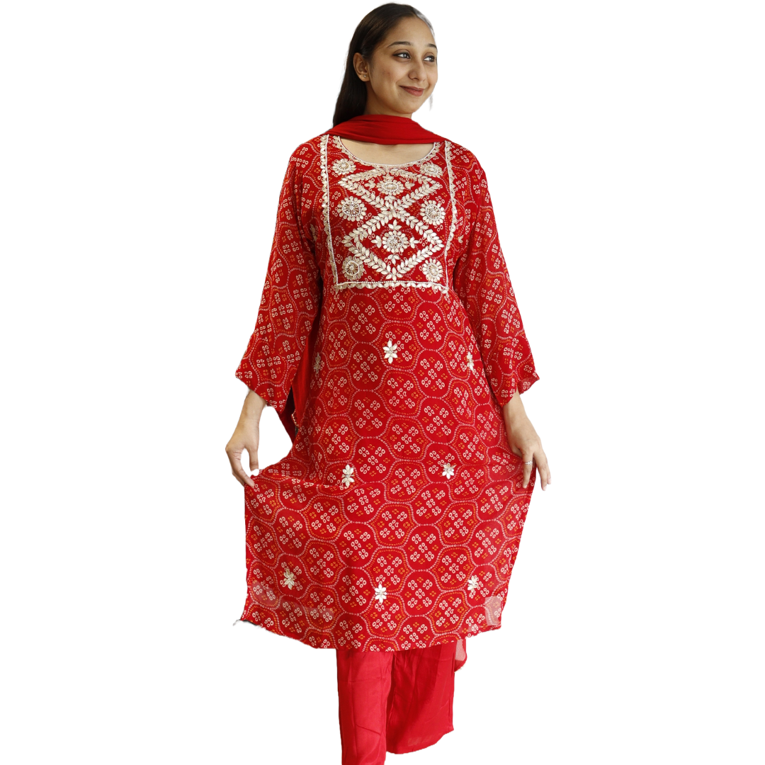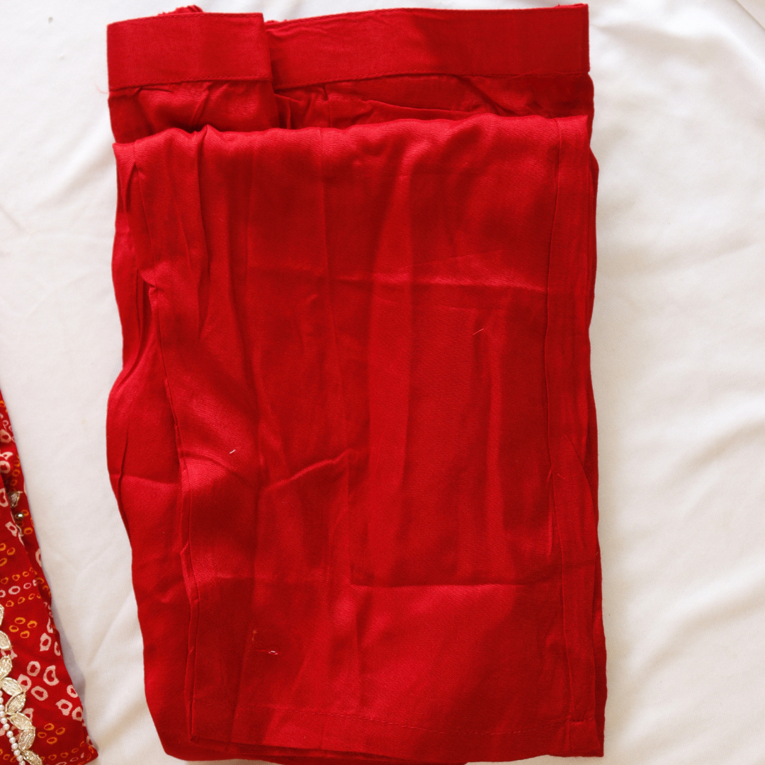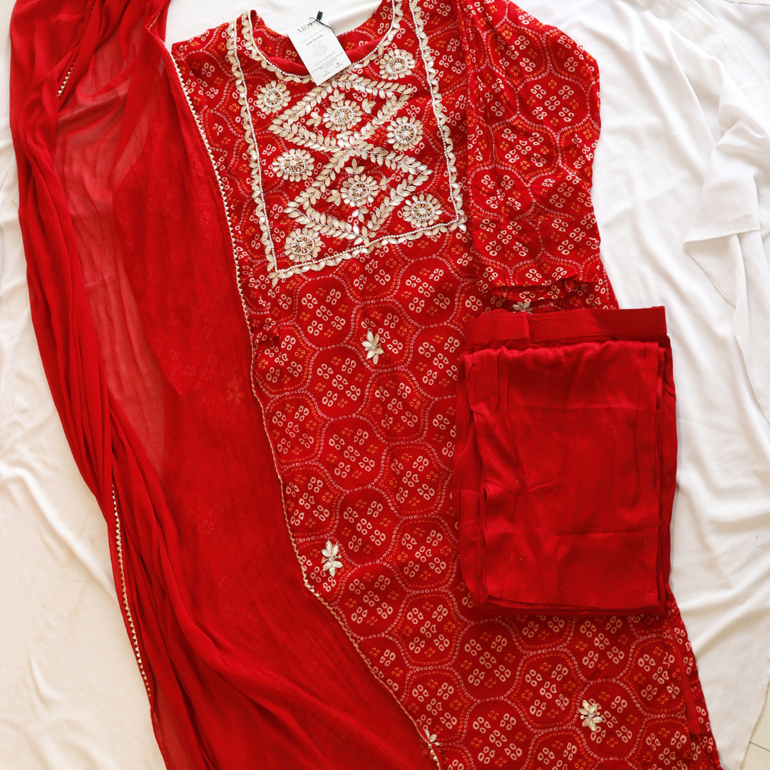 Elevate your ethnic wardrobe with our Red Bandhej Gota Patti Suit Set. Featuring a vibrant red bandhej design and intricate gota patti detailing, this set is perfect for weddings, festivals, and special occasions. Made with high-quality fabric, this set not only looks stunning but also feels comfortable and luxurious. Complete your look with this elegant and timeless piece.