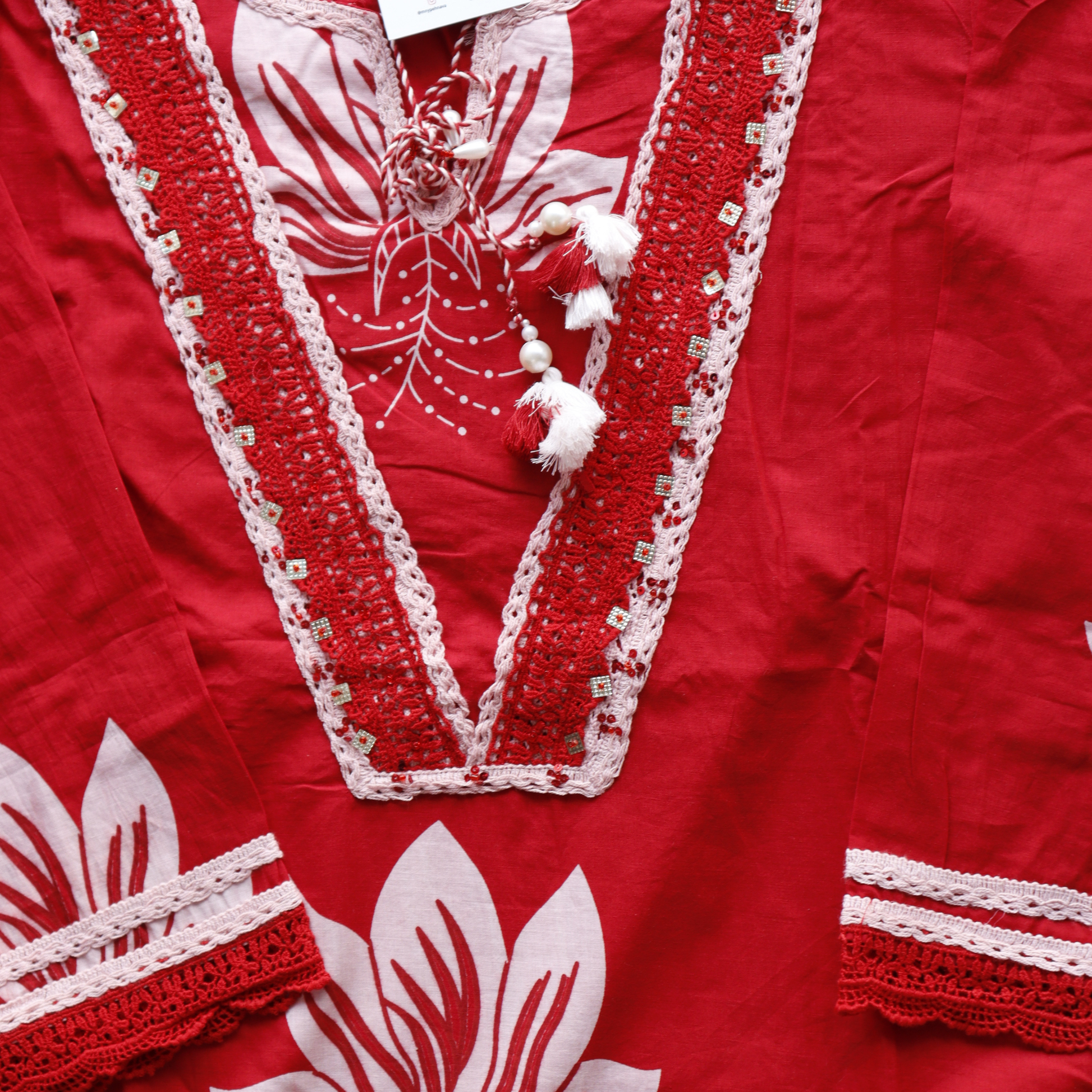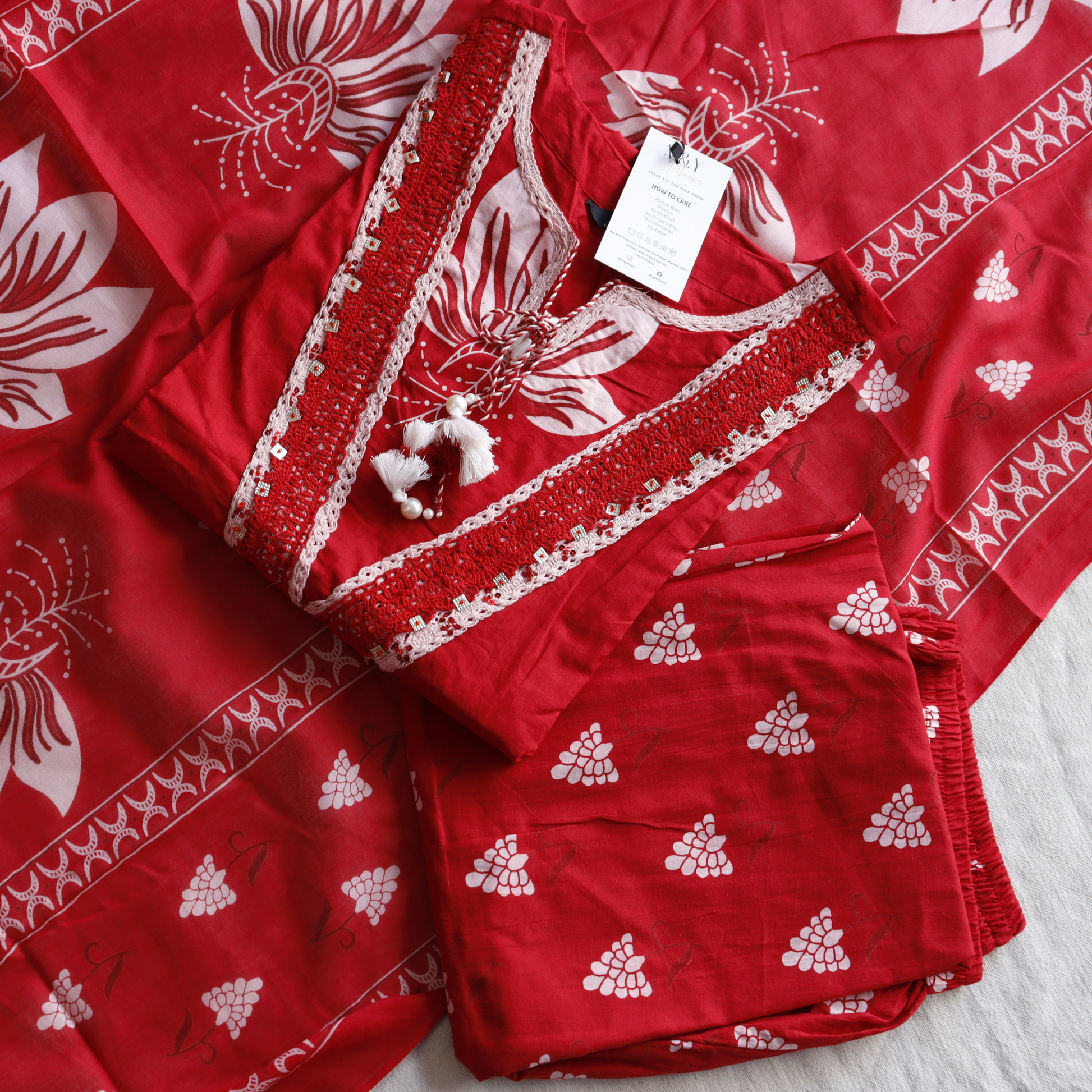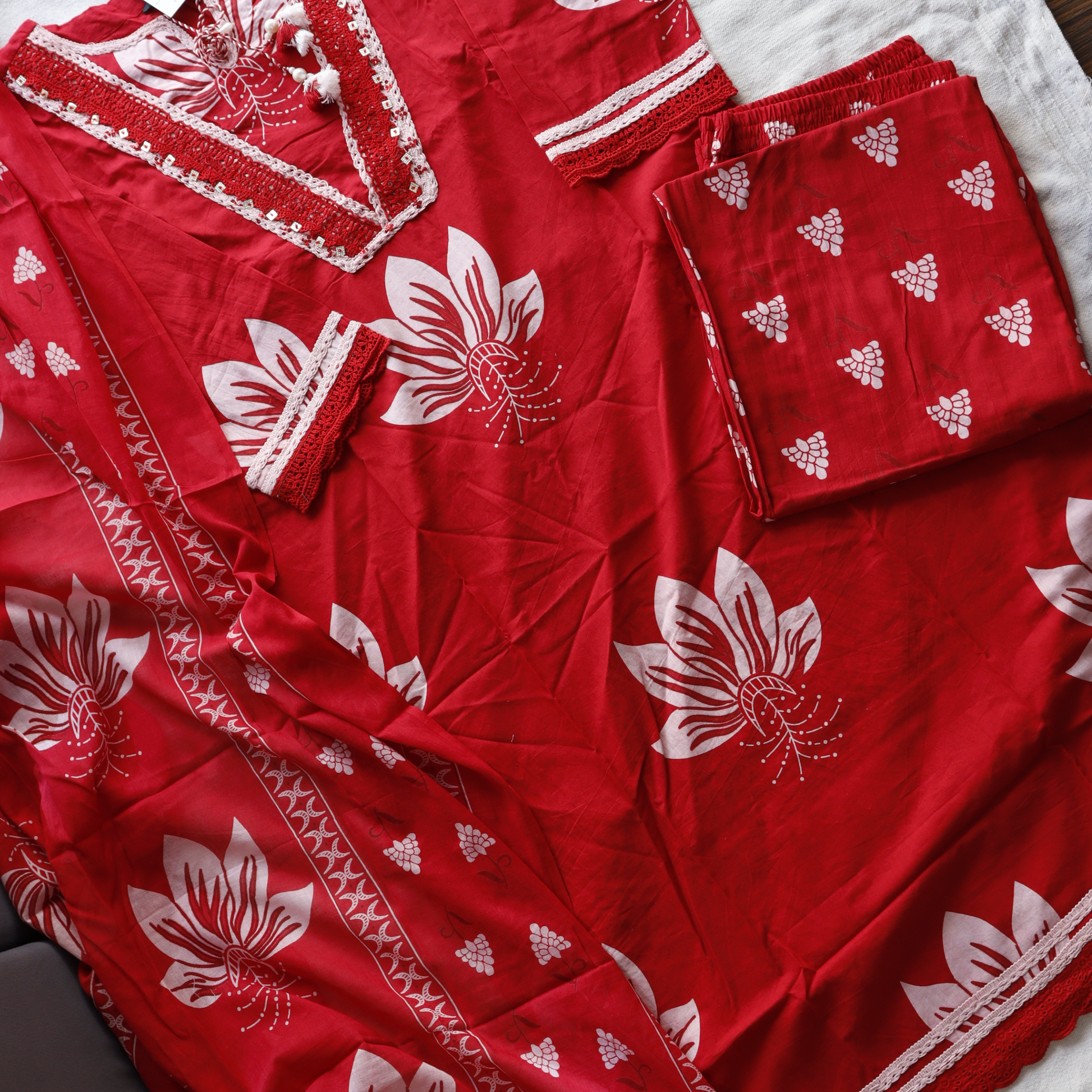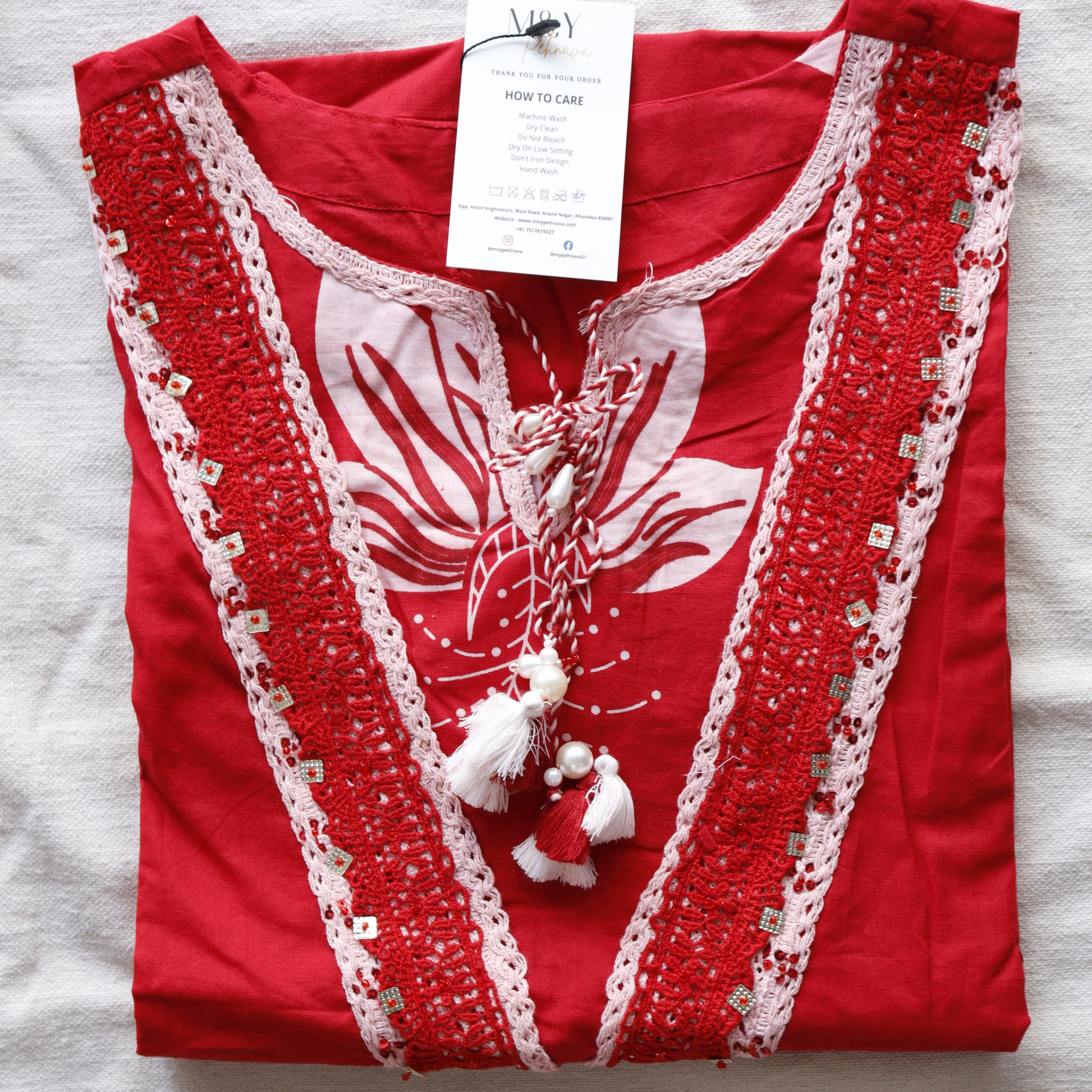 Experience comfort and style with the Red Mulmul Cotton Semi Palazzo Set. Crafted from breathable mulmul cotton, this set offers a lightweight feel perfect for warm weather. The semi-palazzo design provides ease of movement while maintaining a chic silhouette. Ideal for casual outings or relaxed gatherings, this ensemble combines traditional fabric with contemporary tailoring for a versatile wardrobe addition.
