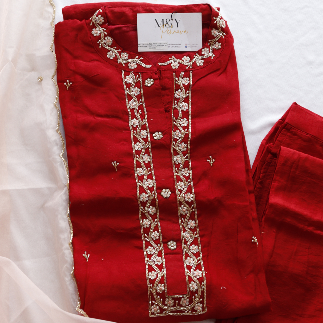 Look stunning in this Red with Peach Dupatta Suit Set. Crafted from quality fabric, this stylish set includes a floor-length kurta, a pair of palazzo pants, and a printed dupatta. Perfect for special occasions, this suit set is sure to make a statement.