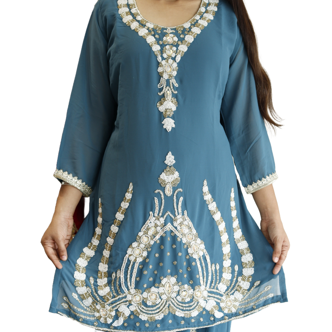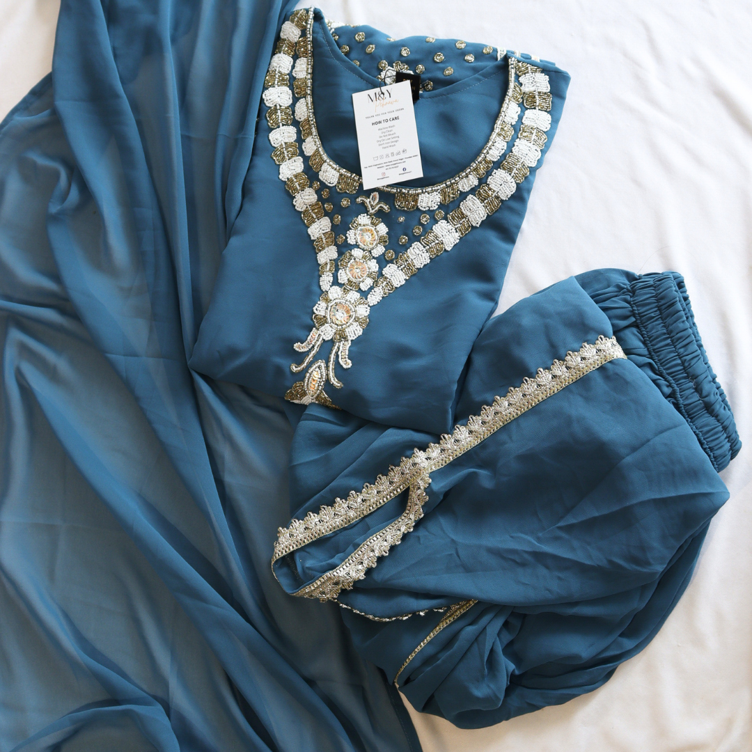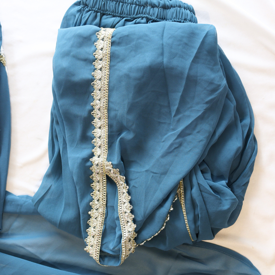 Elevate your style with our Teal Blue Party Wear Dhoti Suit Set! This set features a stunning teal blue color and a unique dhoti-style bottom, perfect for any special occasion. Made with high-quality materials, our suit set offers both comfort and style. Upgrade your wardrobe with this must-have piece.