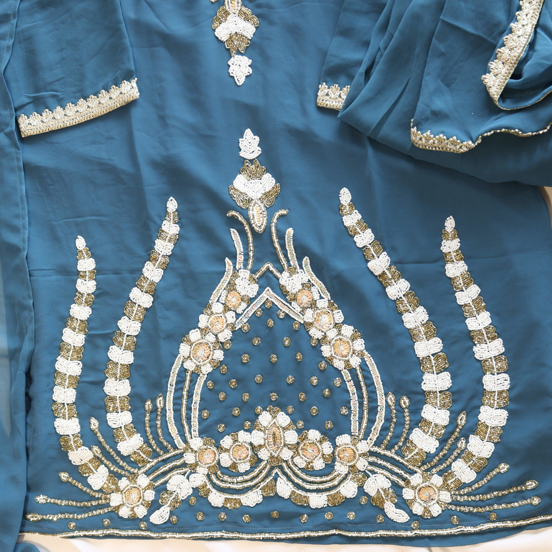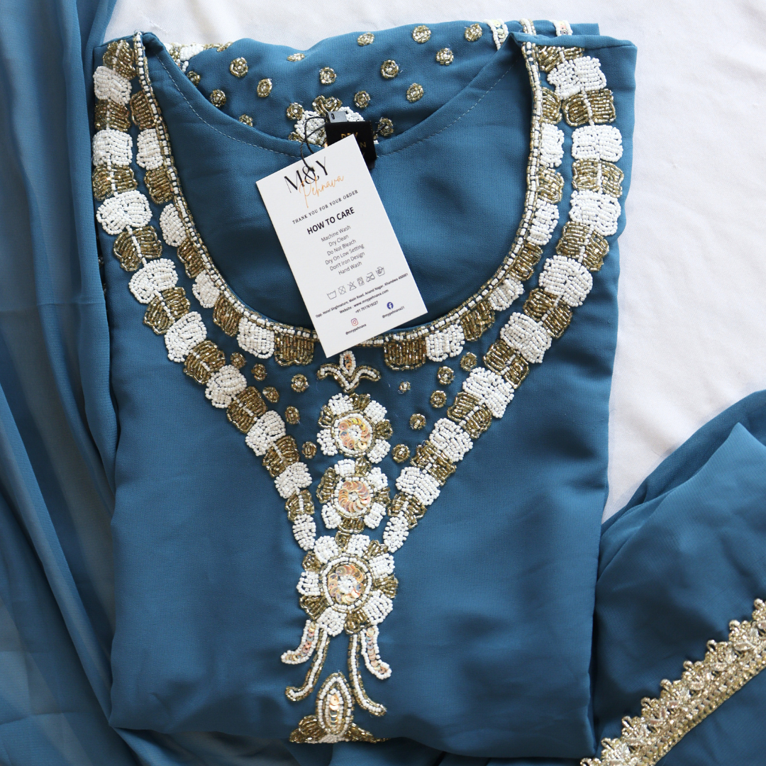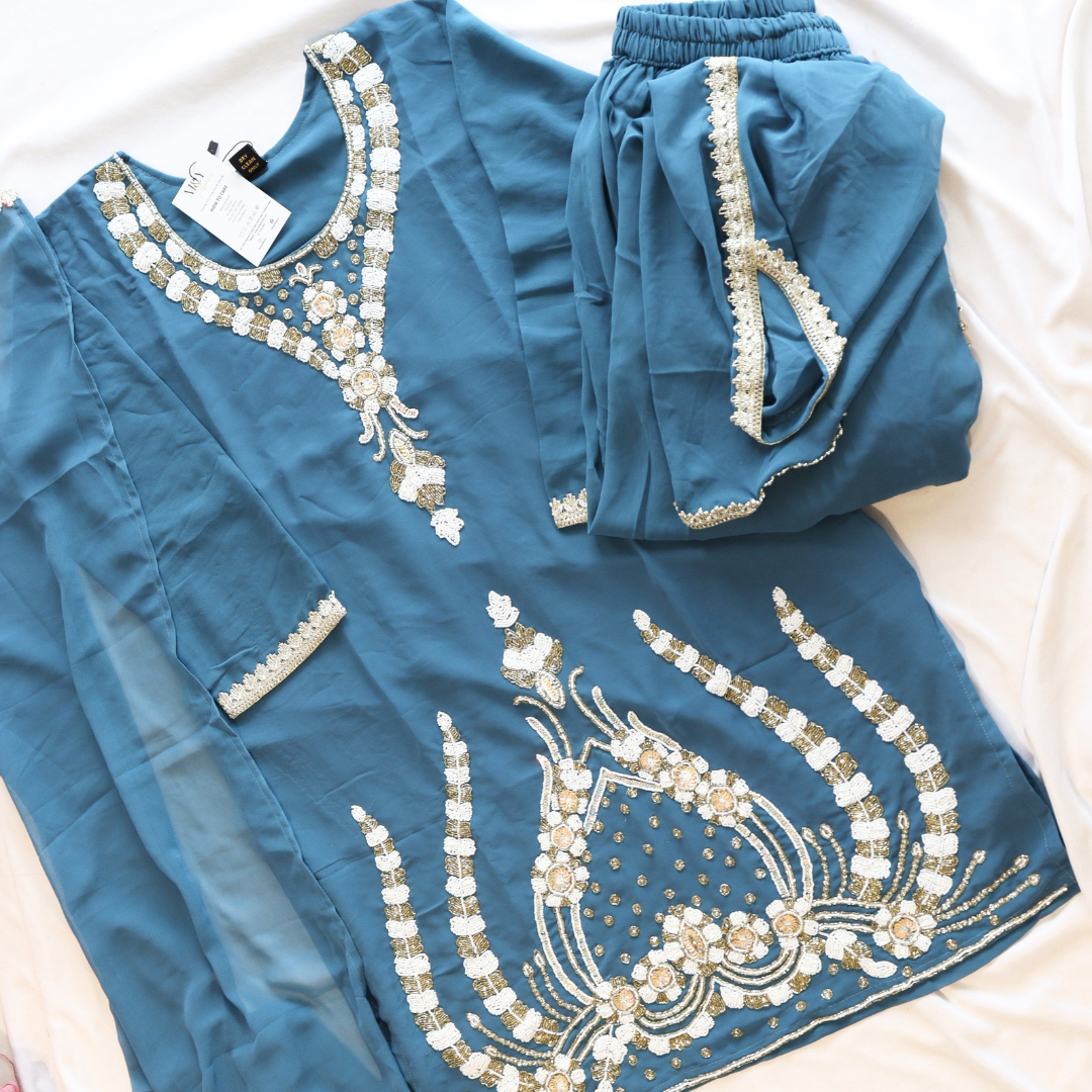 Elevate your style with our Teal Blue Party Wear Dhoti Suit Set! This set features a stunning teal blue color and a unique dhoti-style bottom, perfect for any special occasion. Made with high-quality materials, our suit set offers both comfort and style. Upgrade your wardrobe with this must-have piece.