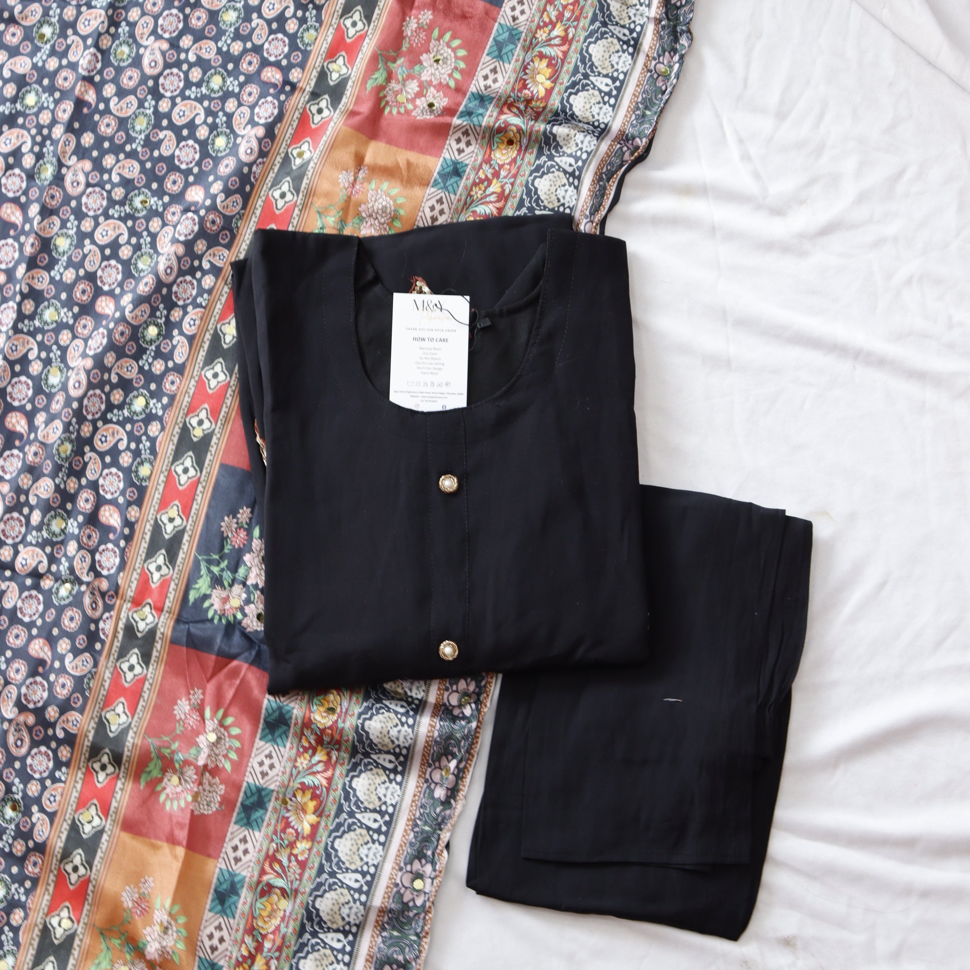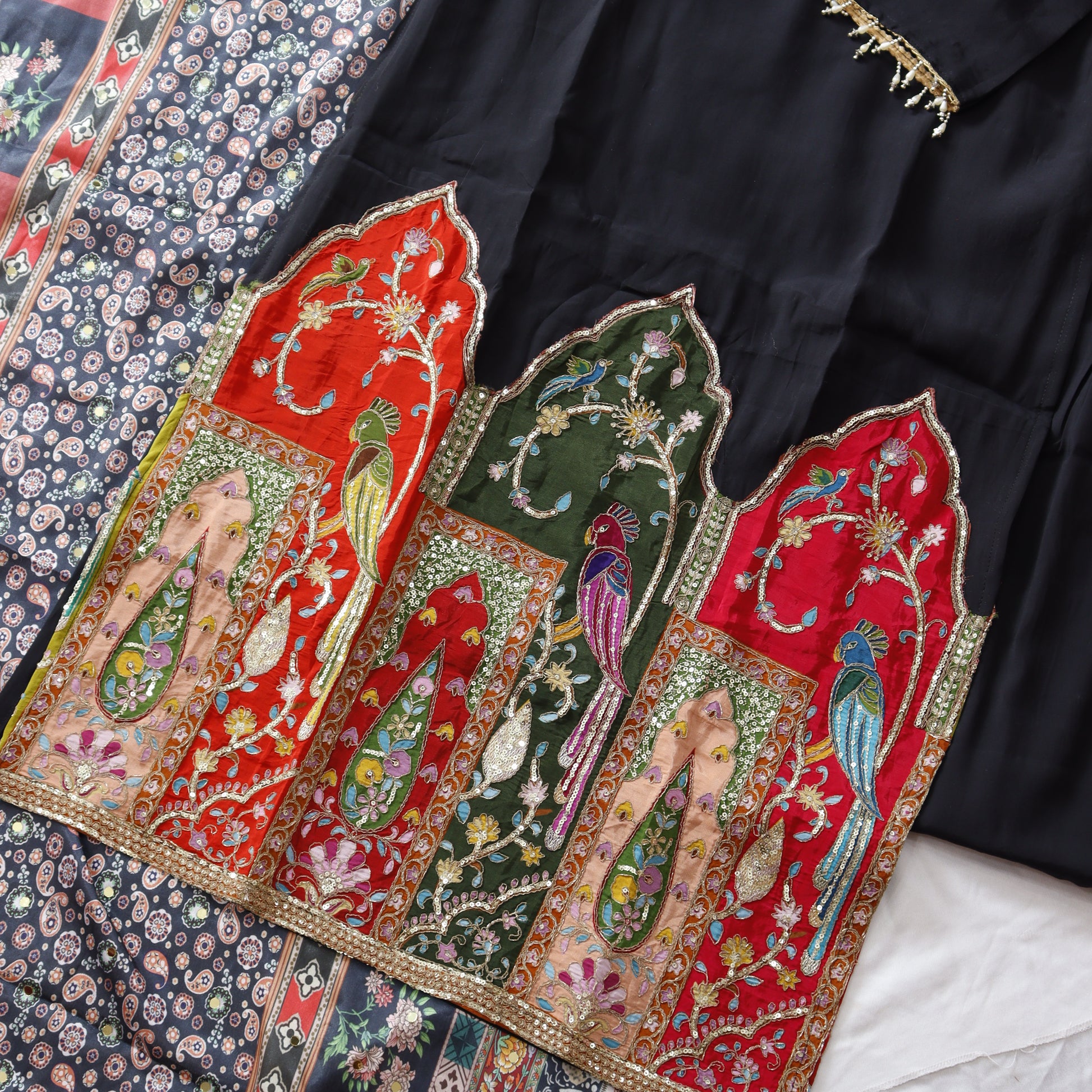 Experience elegance with the Black Temple Handwork Tissue Embroidered Suit, crafted from delicate tissue fabric for a lightweight and graceful drape. Intricate hand embroidery showcases exquisite craftsmanship, adding a rich texture and refined detail to the ensemble. Ideal for formal occasions, this suit combines traditional artistry with sophisticated style, ensuring both comfort and a striking presence. Perfect for those seeking timeless elegance with artisanal quality.