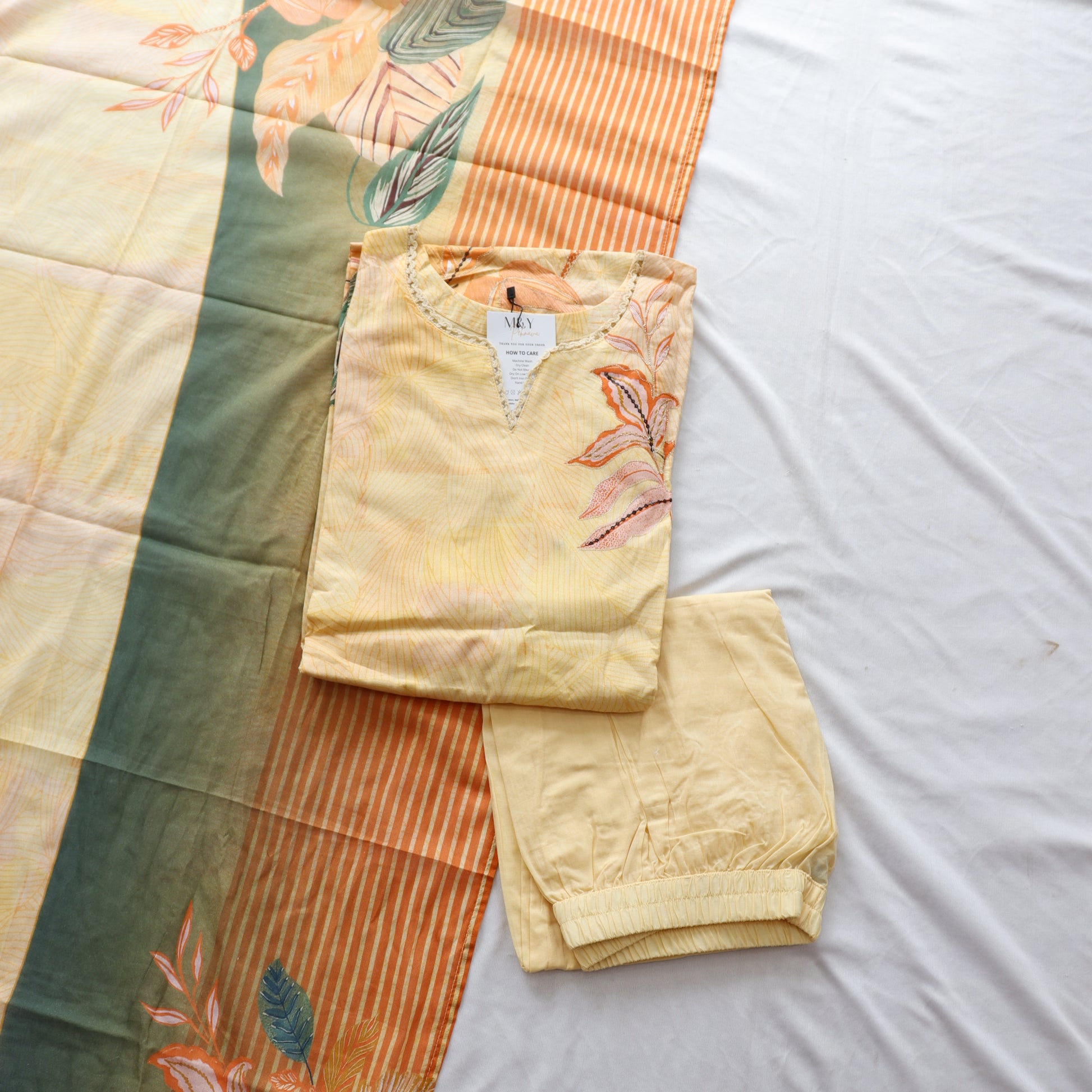 Crafted from soft mul cotton, this Digital Print Suit Set features exquisite hand embroidery that enhances its traditional appeal. The breathable fabric ensures comfort throughout the day, while the detailed embroidery provides a subtle, elegant texture. Combining contemporary digital prints with artisanal craftsmanship, this suit set is ideal for those seeking a sophisticated and comfortable outfit for various occasions.