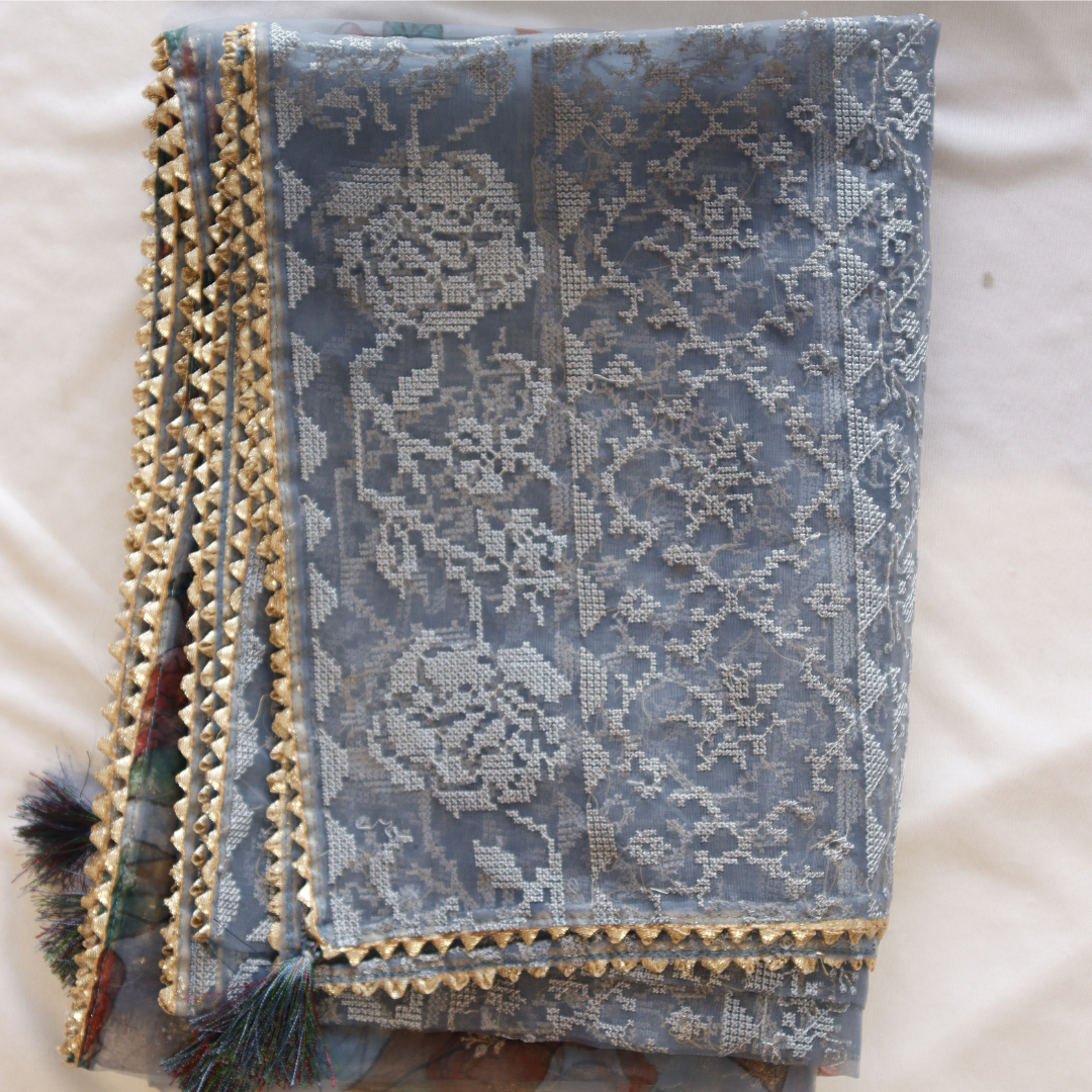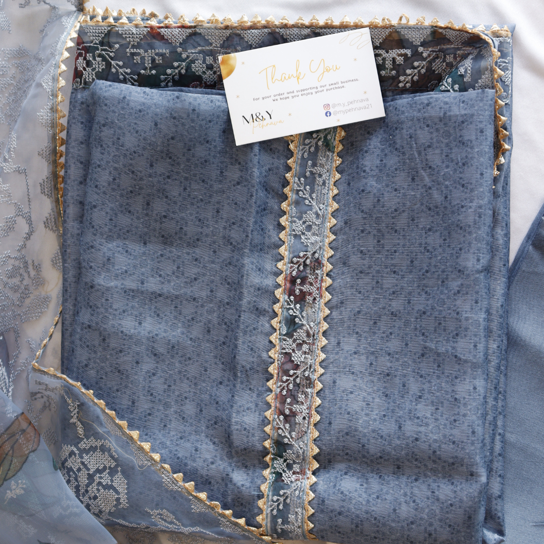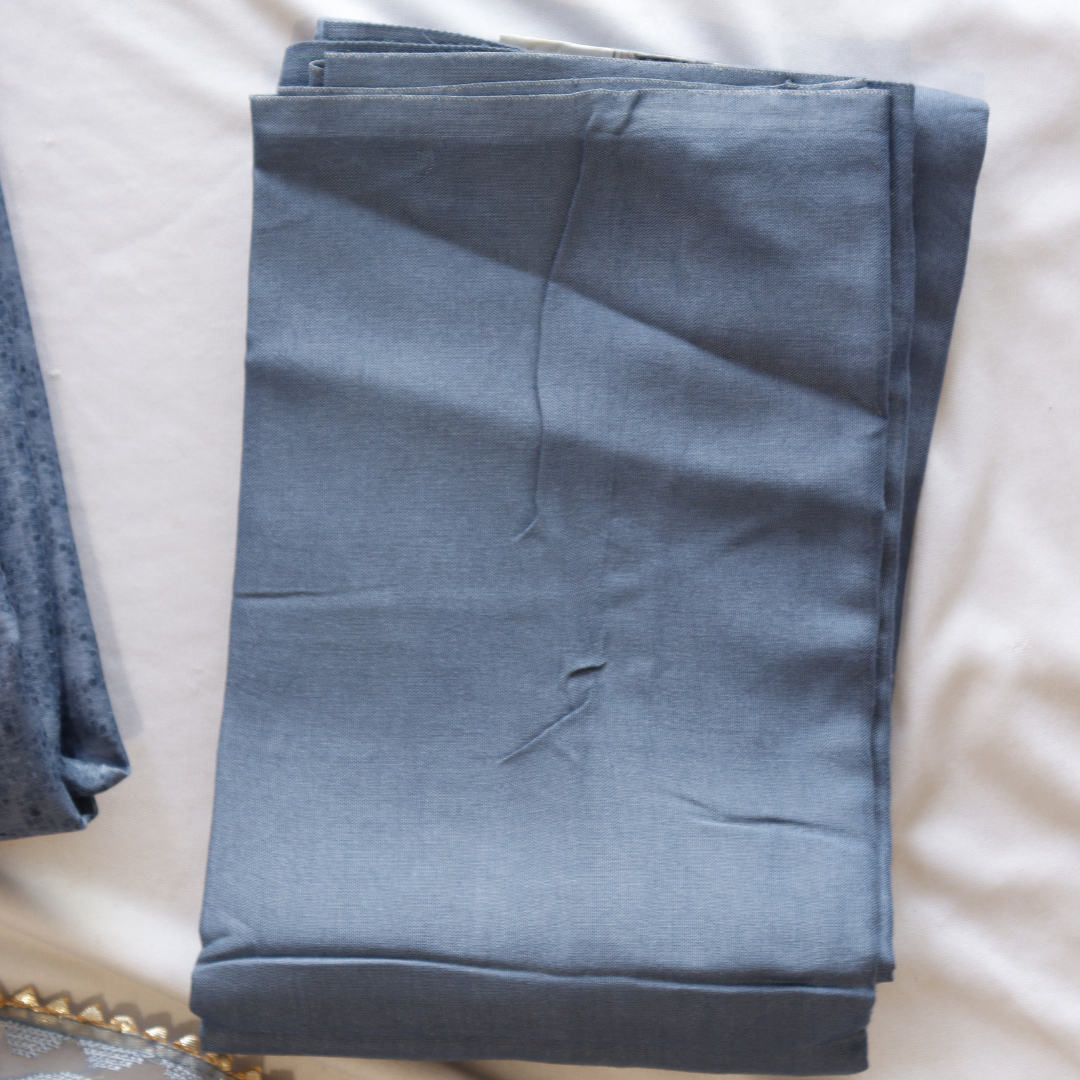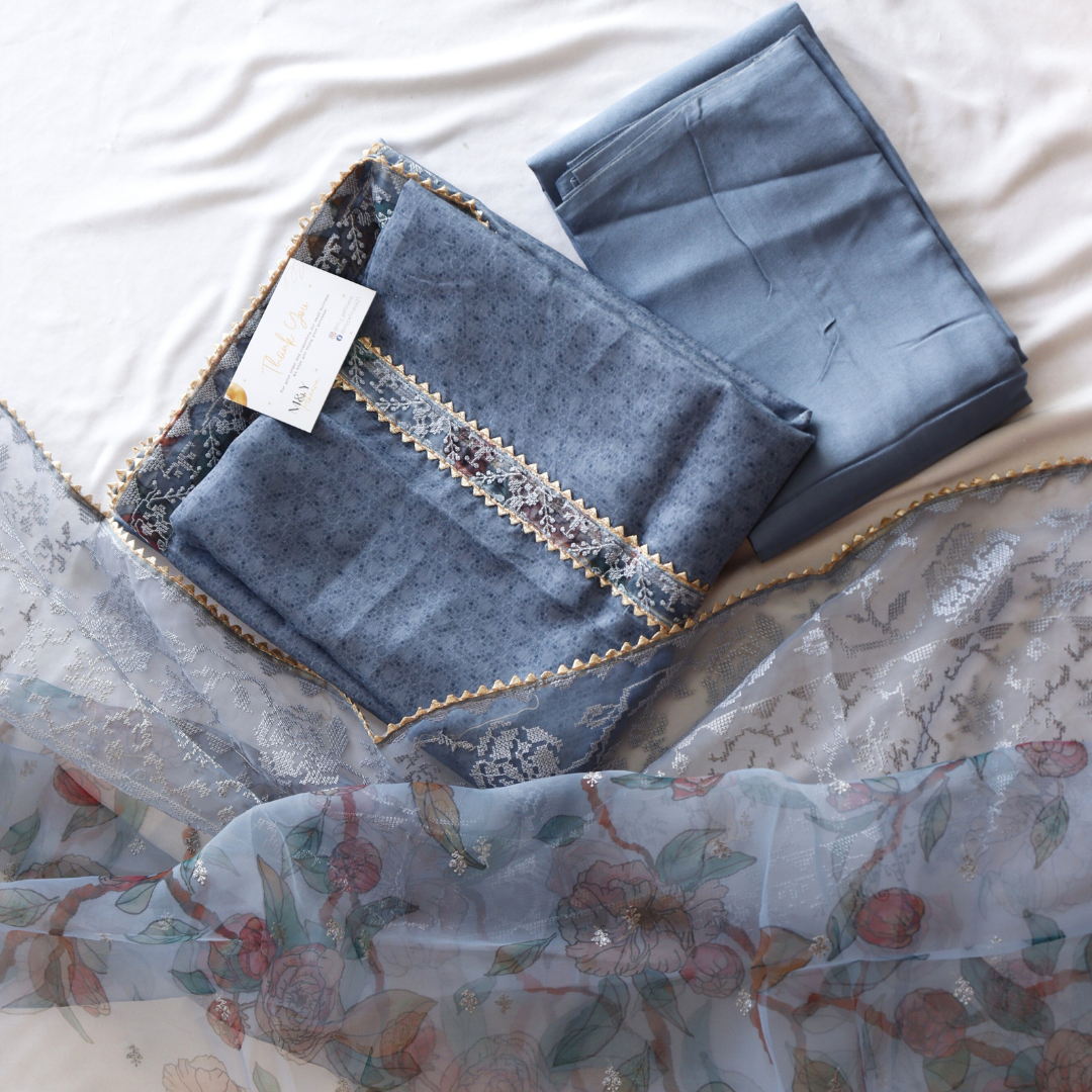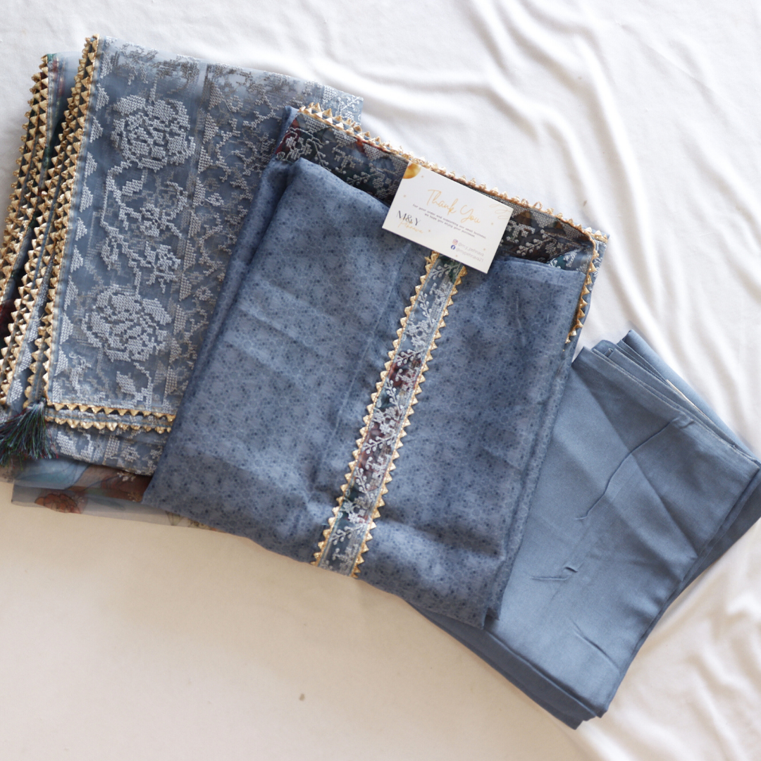 Elevate your style with our Greyish Blue Thread Work Unstitched Suit Set. Crafted with intricate threadwork, this set exudes elegance and sophistication. Perfect for any occasion, this set offers comfort and versatility. Elevate your wardrobe and make a statement with our Greyish Blue Thread Work Unstitched Suit Set.