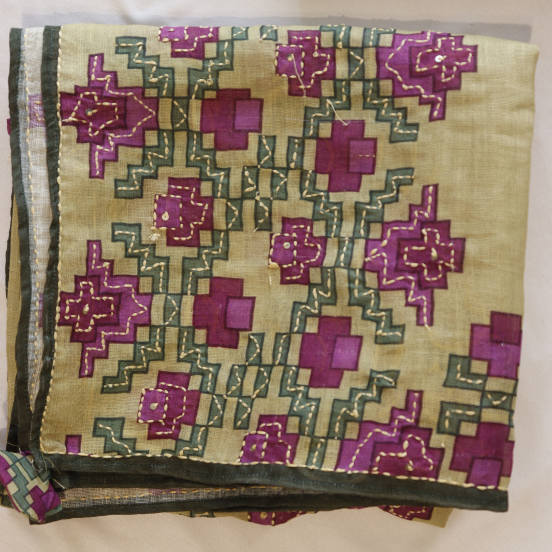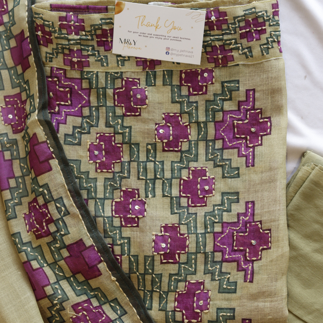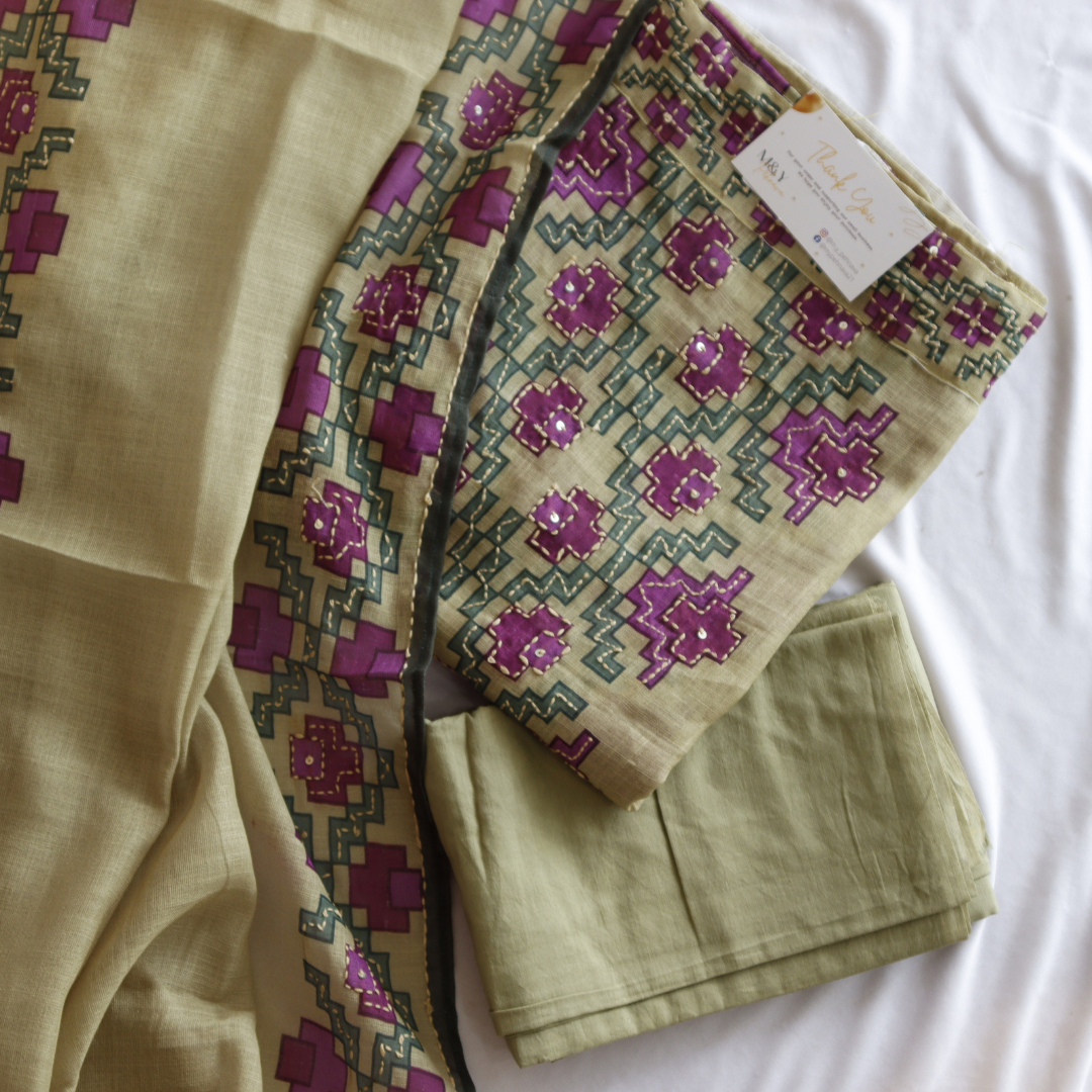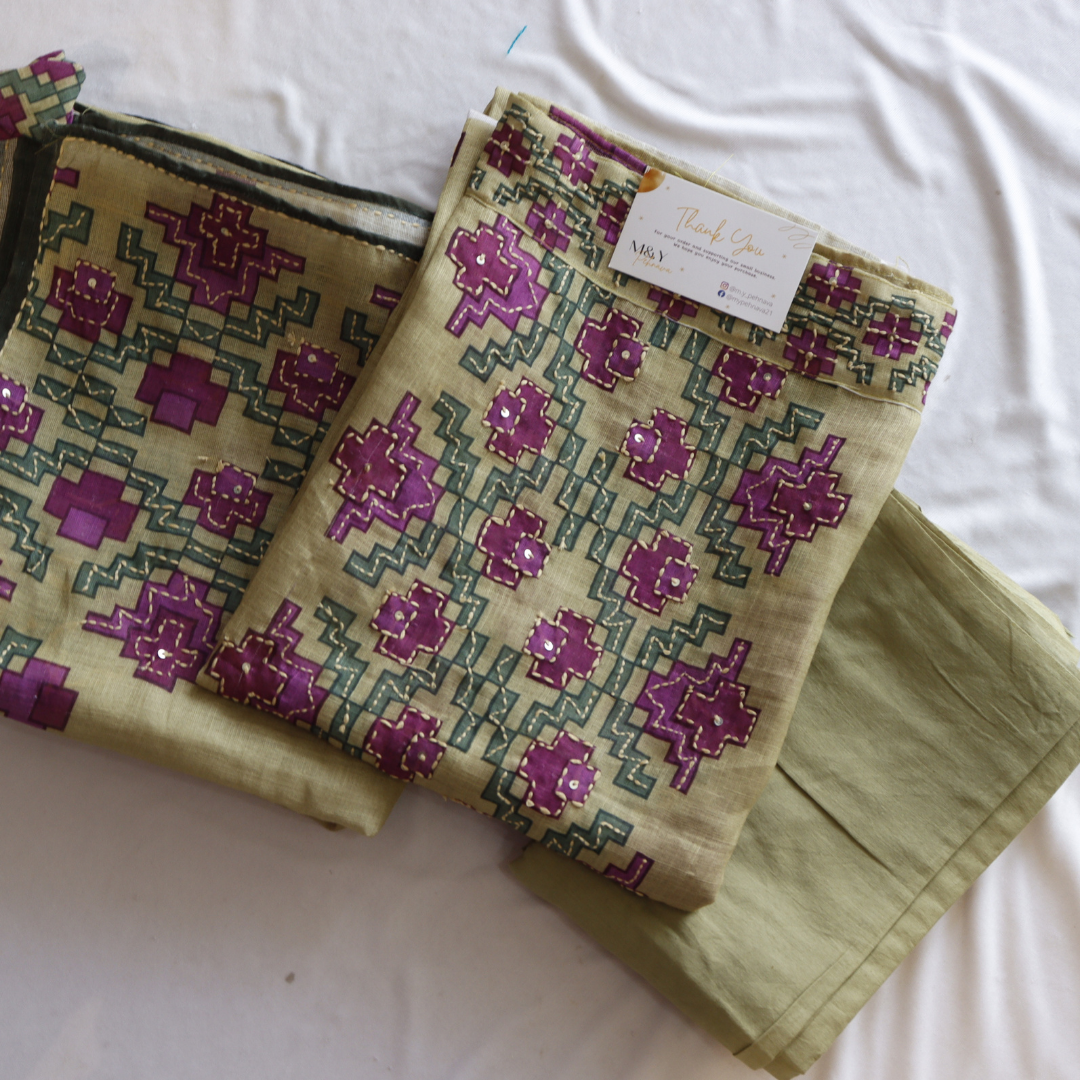 Olive Kantha Work Unstitched Hand Embroidered Suit Set