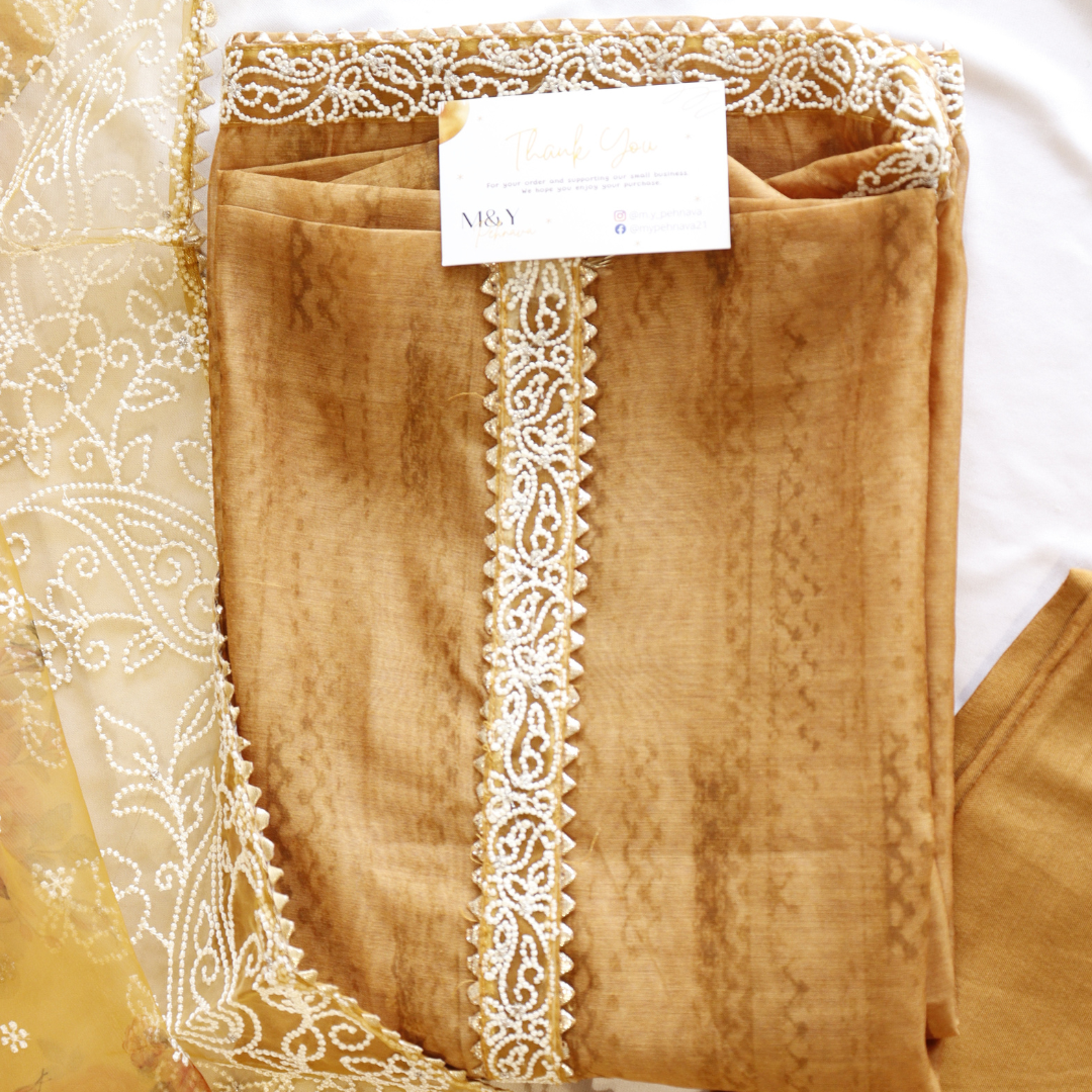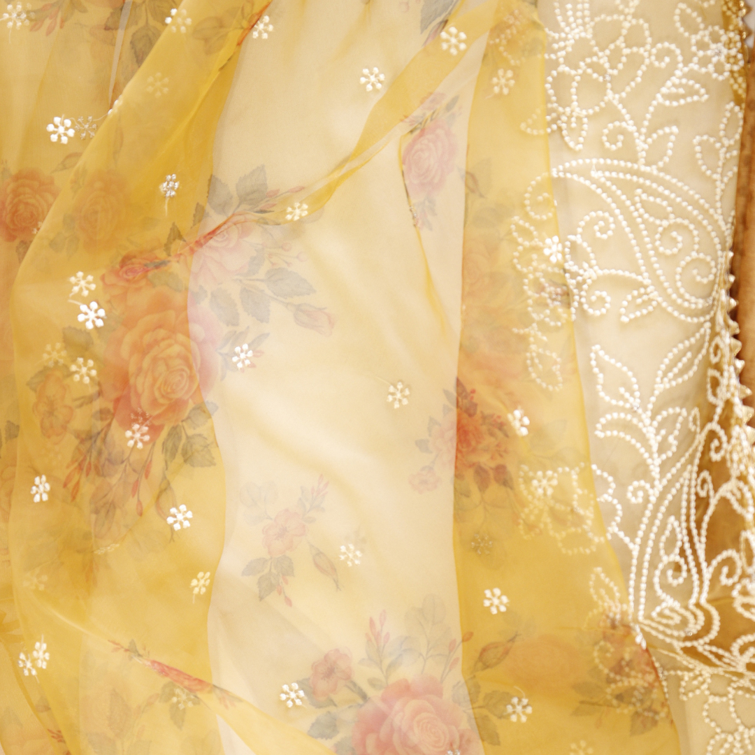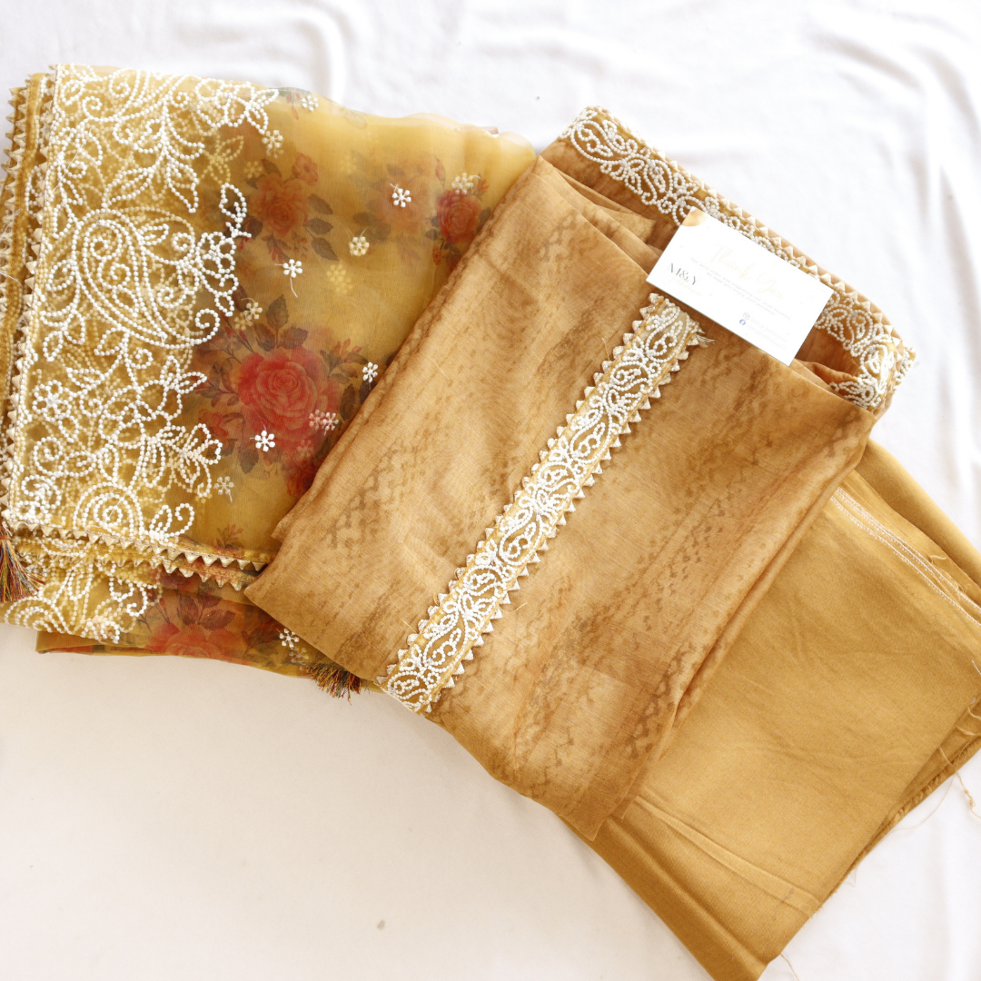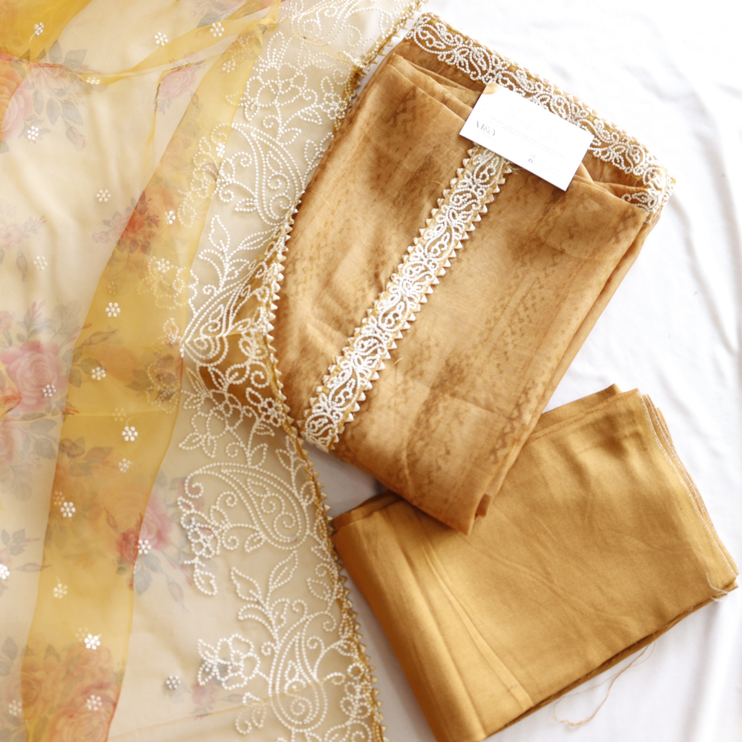 Expertly crafted with exquisite organza thread work, this mustard unstitched suit set is a must-have for any fashion-forward individual. The vibrant hue and delicate detailing make for a timeless and versatile addition to your wardrobe. Elevate your style effortlessly with this stunning piece.