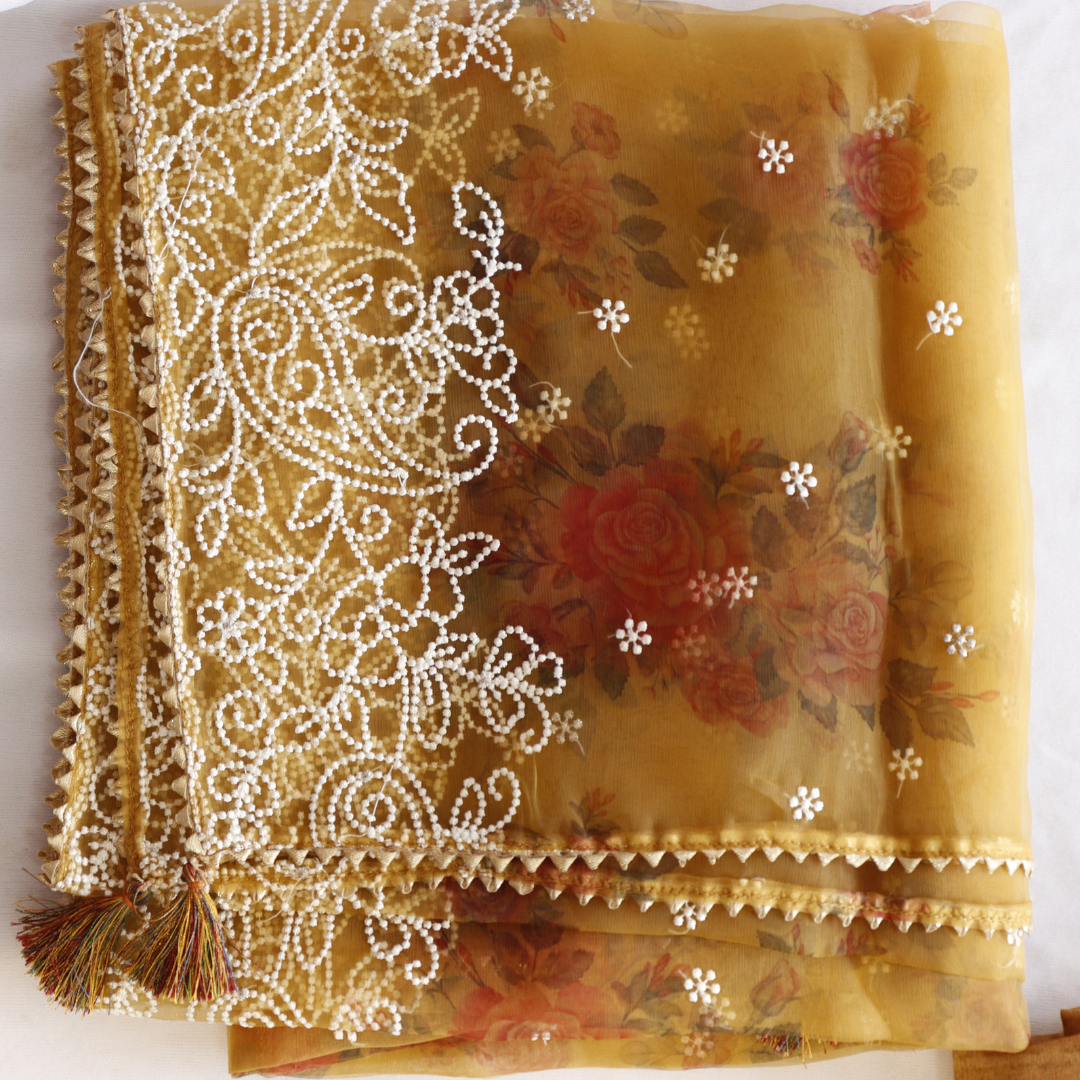 Mustard Organza Thread Work Unstitched Suit Set