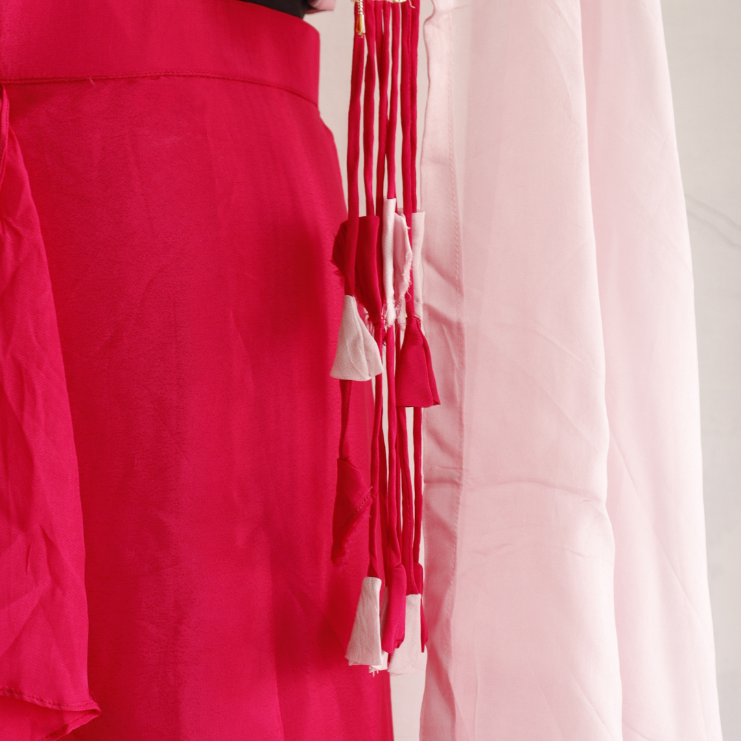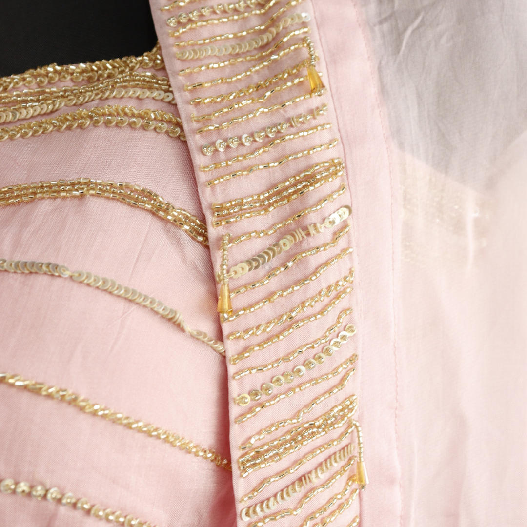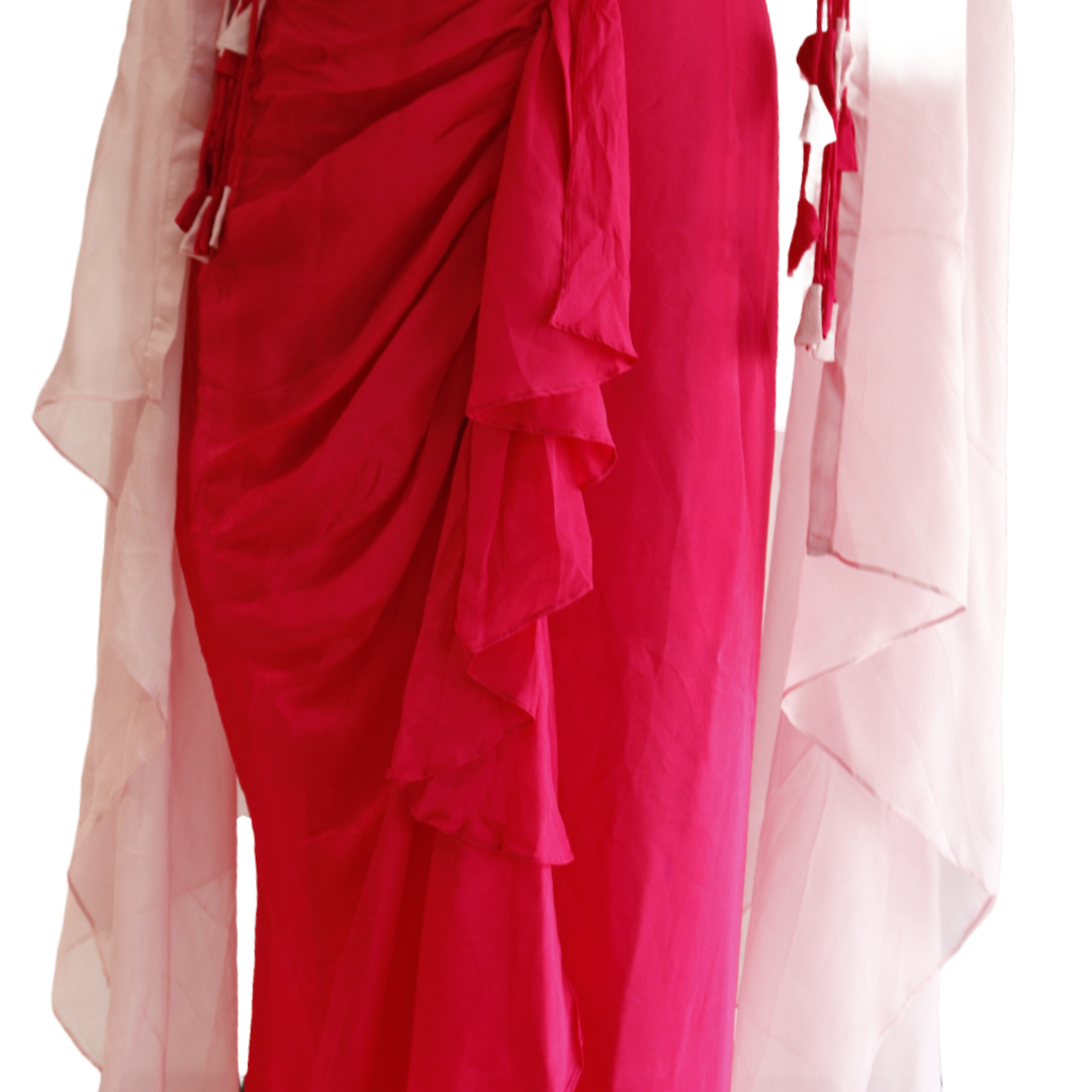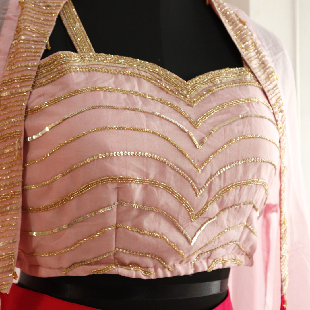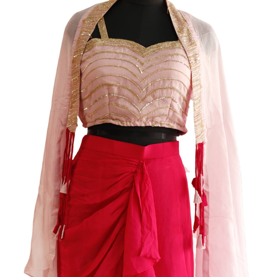 Upgrade your party wardrobe with our Pink Indo-Western 3 Piece Party Wear Set. This elegant set includes a stylish cape, a draped skirt, and a chic crop top in a beautiful pink hue. Perfect for any occasion, this set exudes sophistication and style. Make a statement and stand out from the crowd with this stunning ensemble.